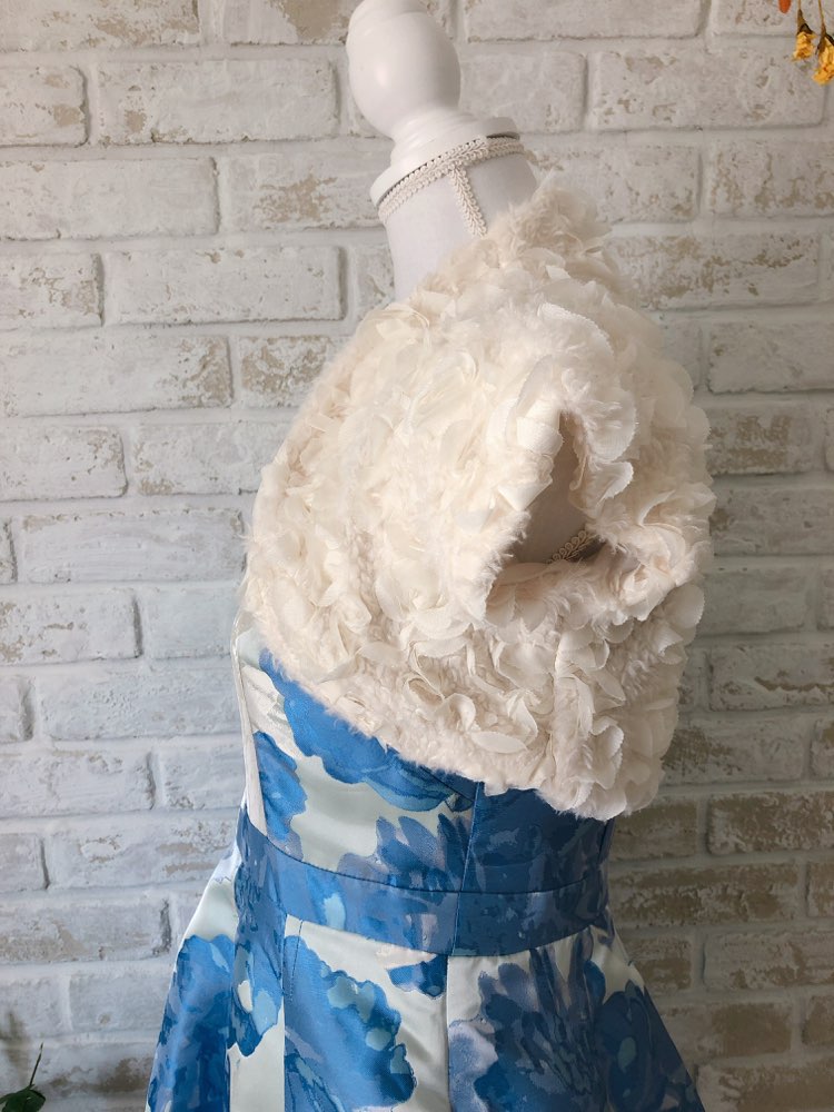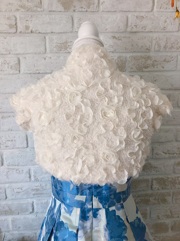丈間短めのホワイトファーボレロです!デザインもお花のようなデザインになっていて、とても華やかでオススメする1点です。ファー自体もそんなに分厚くなく、とても着やすいです。シンプルなドレスに合わせてみたり、色味がホワイトなので、中は暗いカラーのドレスを着ても映えると思いますよ!