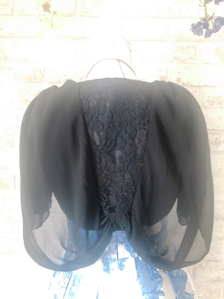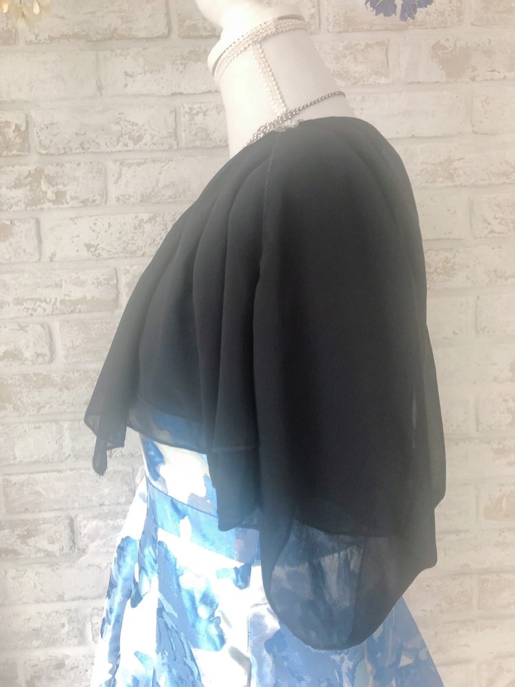 肩にビジュとパールのデザインがついたブラックボレロです!ビジュもポイントとして入っているだけなので、華やかすぎず可愛く着ていただけますし、肩のデザインに合わせて小物やドレスにビジュやパールを取り入れてもいいと思います!