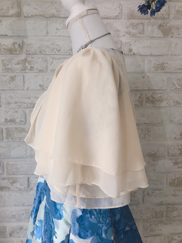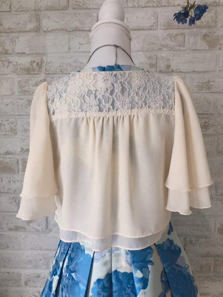 肩のレースデザインがとても可愛くポイントとなっております!フリルが揺れる感じがまた女性らしく、色味もホワイトに近いベージュになるのでどのドレスにも合わせやすいです!