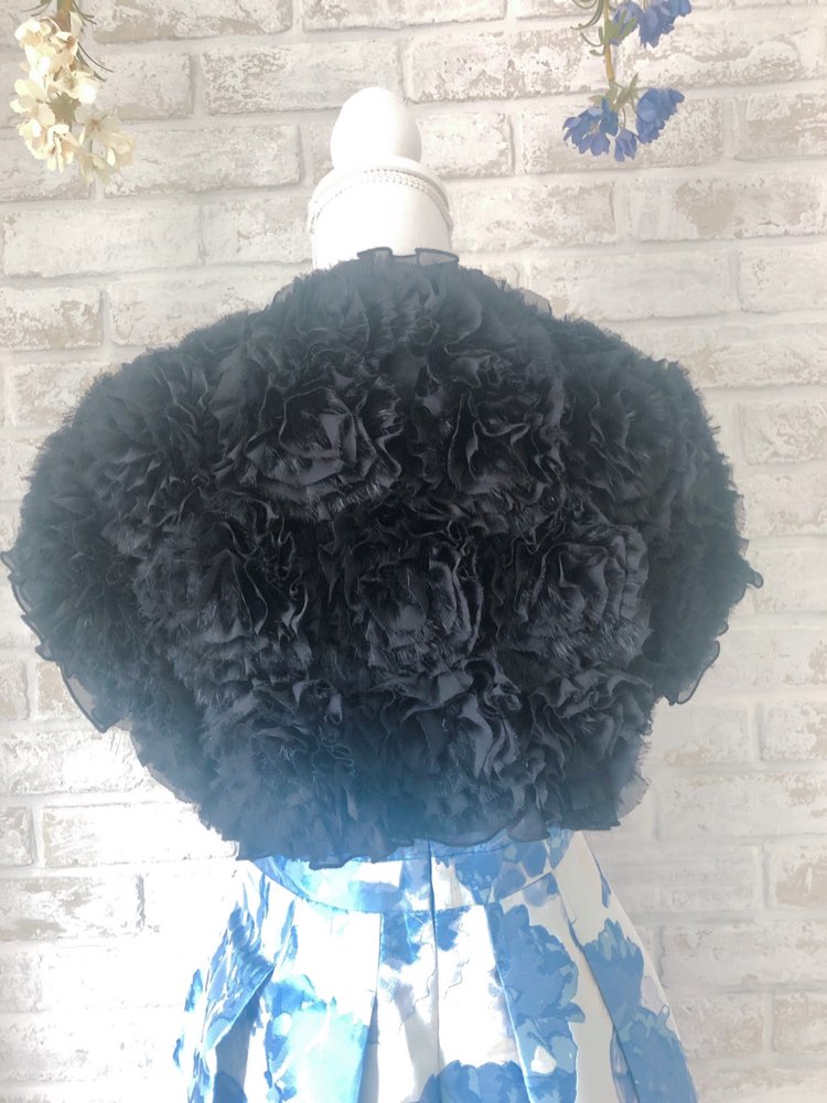シンプルに丈間短めなブラックファーボレロです!フリルデザインとファーのコンビがめちゃくちゃ可愛くて、ブラックで位イメージが出るかと思いますが、そんな印象を与えないくらい華やかで存在感もあり、ファーなので秋冬には特にオススメな1枚です!