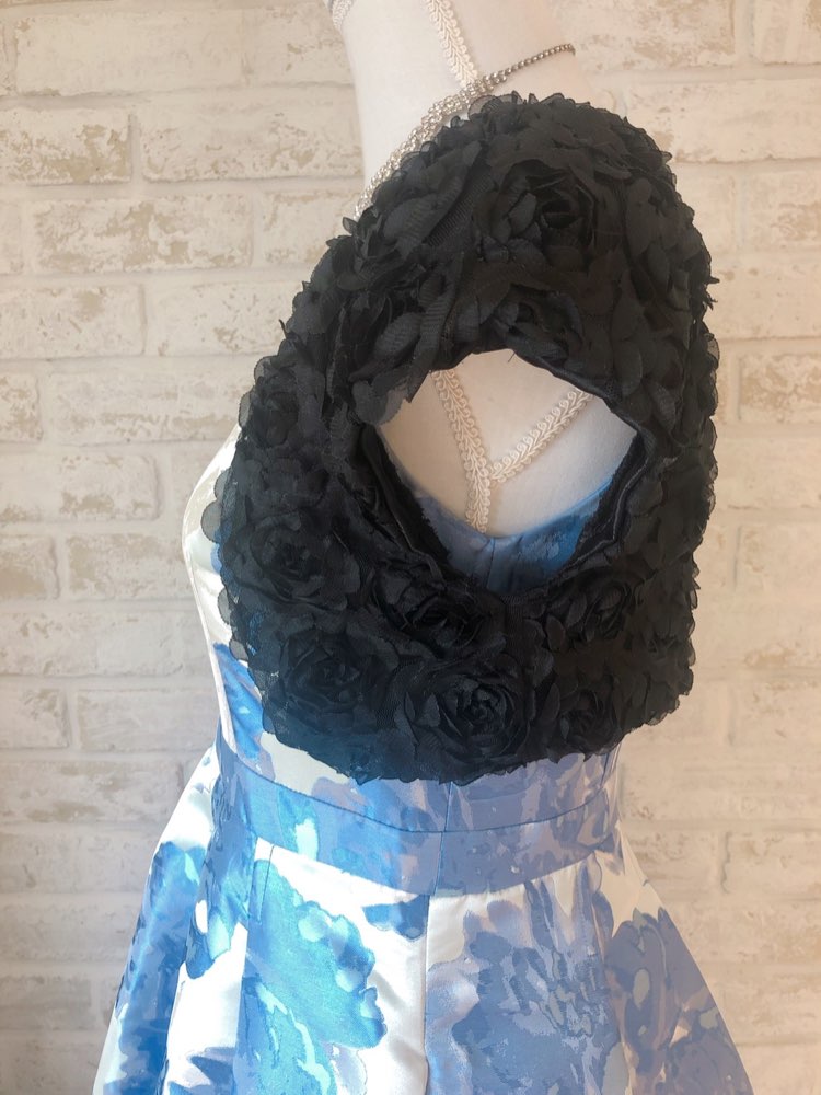 NFBO-39のファーボレロとデザインはとても似ています!ファーではないので、季節感関係なしで着ていただけます!丈間は短めのブラックボレロです。バラのようなデザインのフリルデザインがとても可愛くて華やかに着ていただけます!