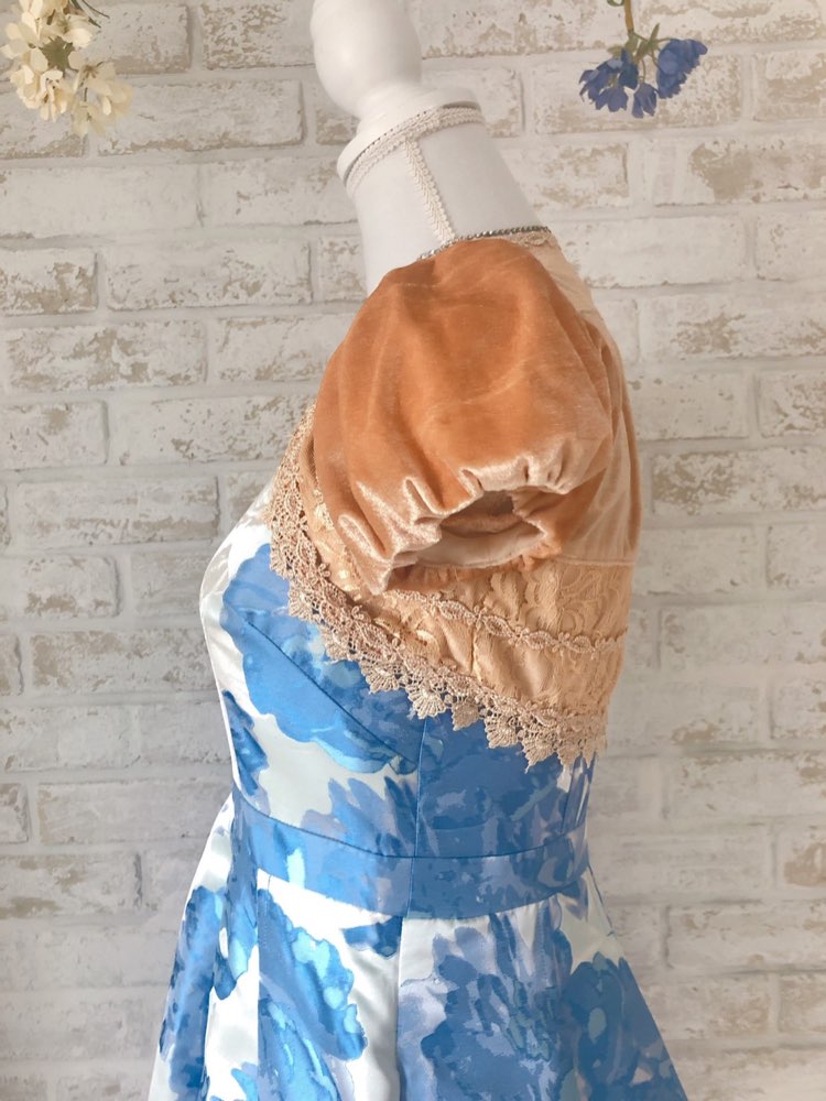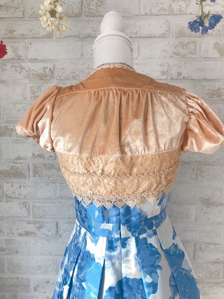 色味はベージュで、ベロア生地のボレロです!NGB-15のボレロの色違いバージョンで、とても優しい色味になっております!ベロアなので秋冬に着るのがオススメです!レースのデザインがとても可愛く、キュートです。