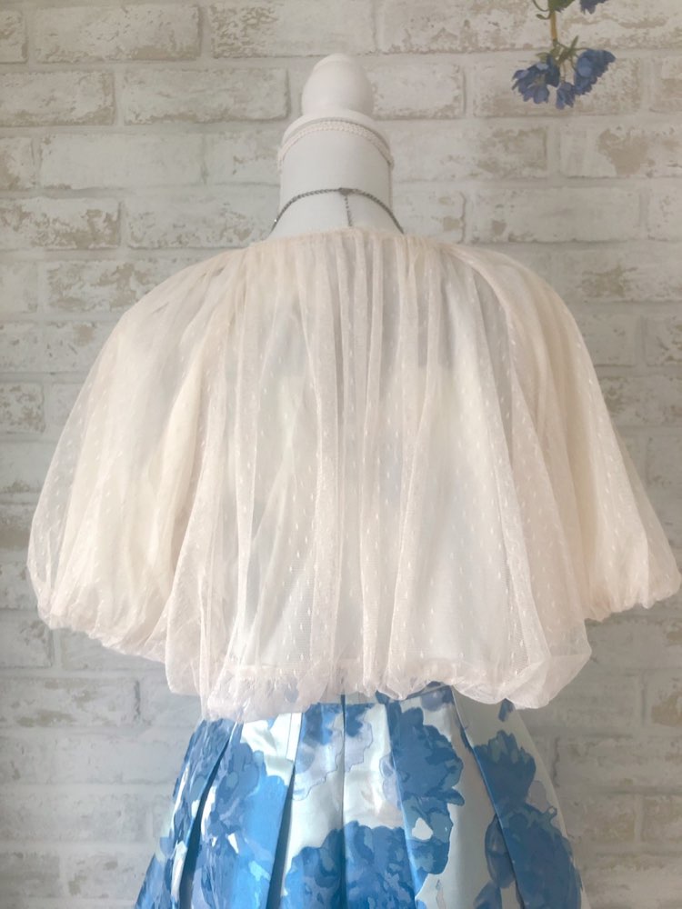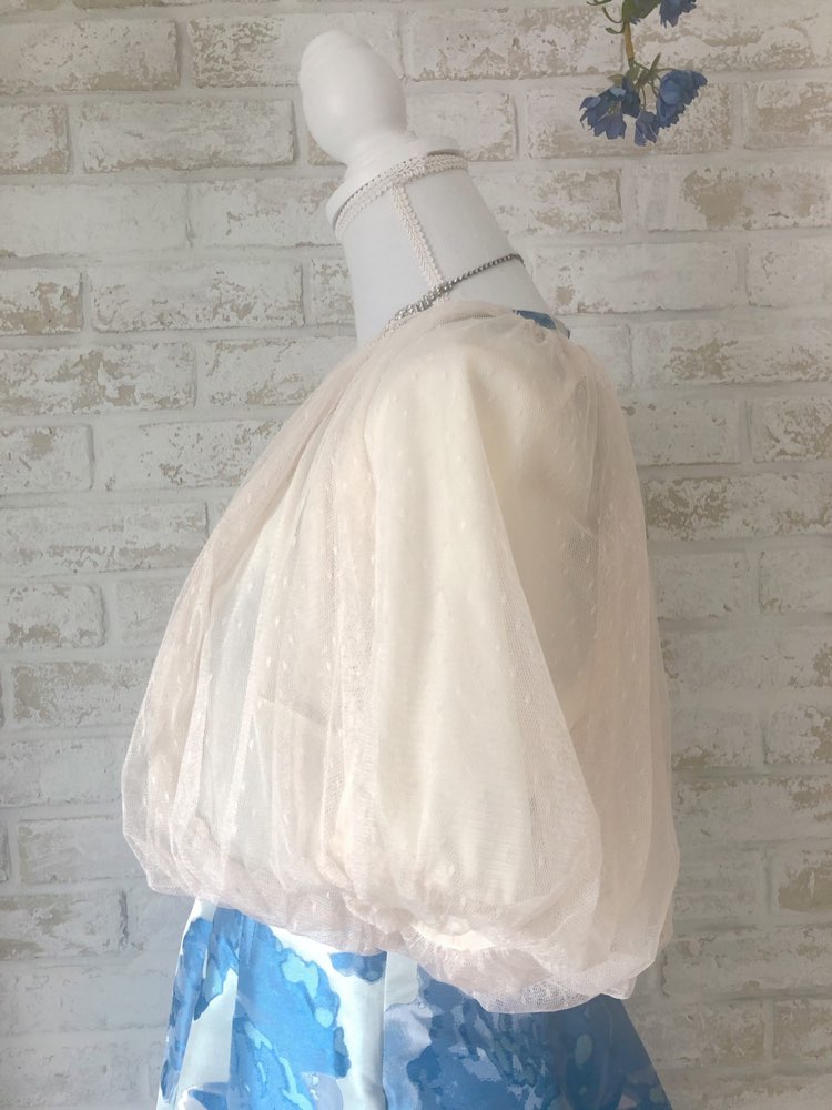 生地感はかなり薄めで、薄くドットのような模様が入っているのも1つのポイントです。ドットだけど主張しすぎず、生地も薄めですがチュール素材なので、ふわっとぼかす感じで着ていただけます。色味もベージュで合わせやすいです。