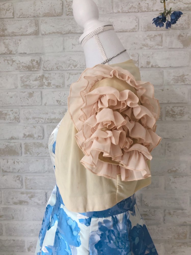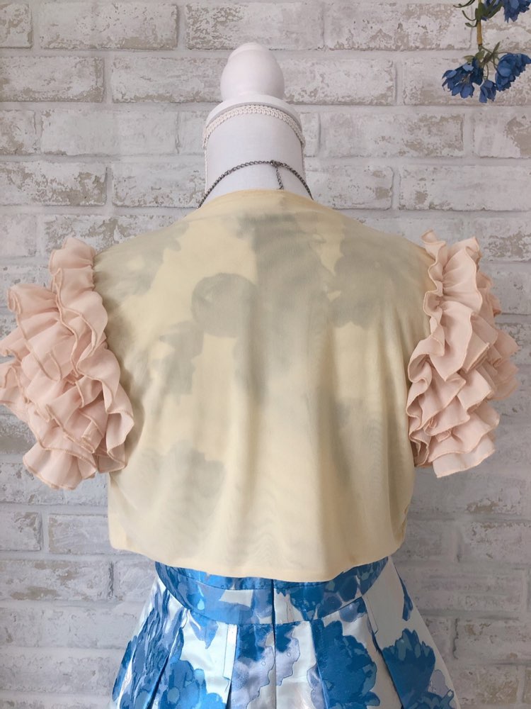 色味はベージュですが、肩の華やかデザインの部分は少しピンクっぽくオレンジ系。濃いめのベージュといった感じで少し変わった形のデザインです!こちらのボレロ1枚でも十分華やかになるのでシンプルめなドレスに合わせても可愛いです!