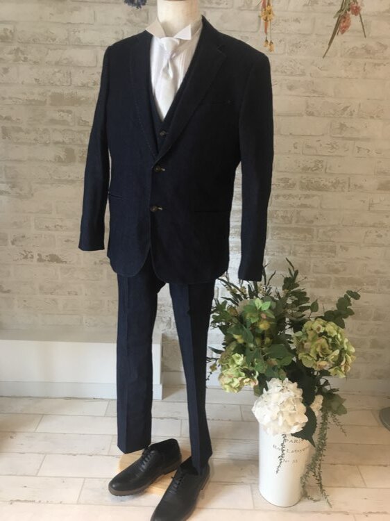同じデザインのジャケットも展開しております。デニム生地のため伸縮性はないためピッタリサイズになりますので、ご試着してお選びいただくことをおすすめ致します。ジャケットとパンツはサイズ違いでもお選び頂けますので、一人一人お客様にあったサイズ感でお求め頂けます。またデニム生地はあまり見かけないため、オシャレで他の参列者の目を引く一着になっております。メンズの標準Lサイズです。デニム生地なので伸びたり、調節は出来ないためピッタリめなサイズ感です。サイズも標準的なS,M.Lのサイズ展開です。