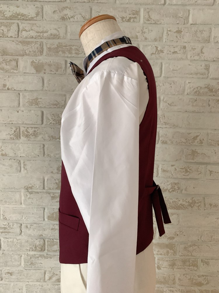 ボルドーのベストであまり見かけない個性的な一品です。パーティーや二次会向きになります。他の方と被りたくない方や個性を出したい方にオススメです!サイズはMサイズです。