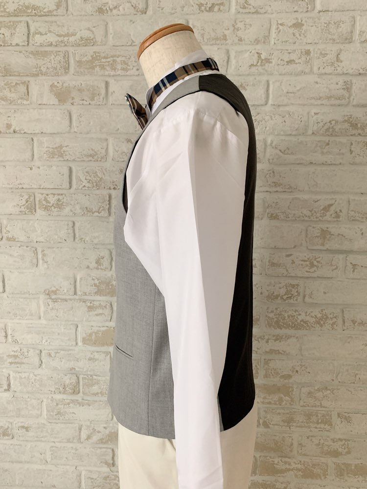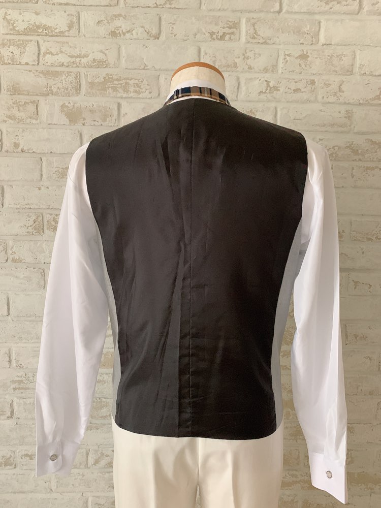 シンプルなグレーベストですが、ボタンが黒色でポイントになり可愛いです。サイズ感も良くシンプルながらもおしゃれな一品です。スーツのお色味も選ばず合わせていただけます。サイズはメンズMサイズになります。