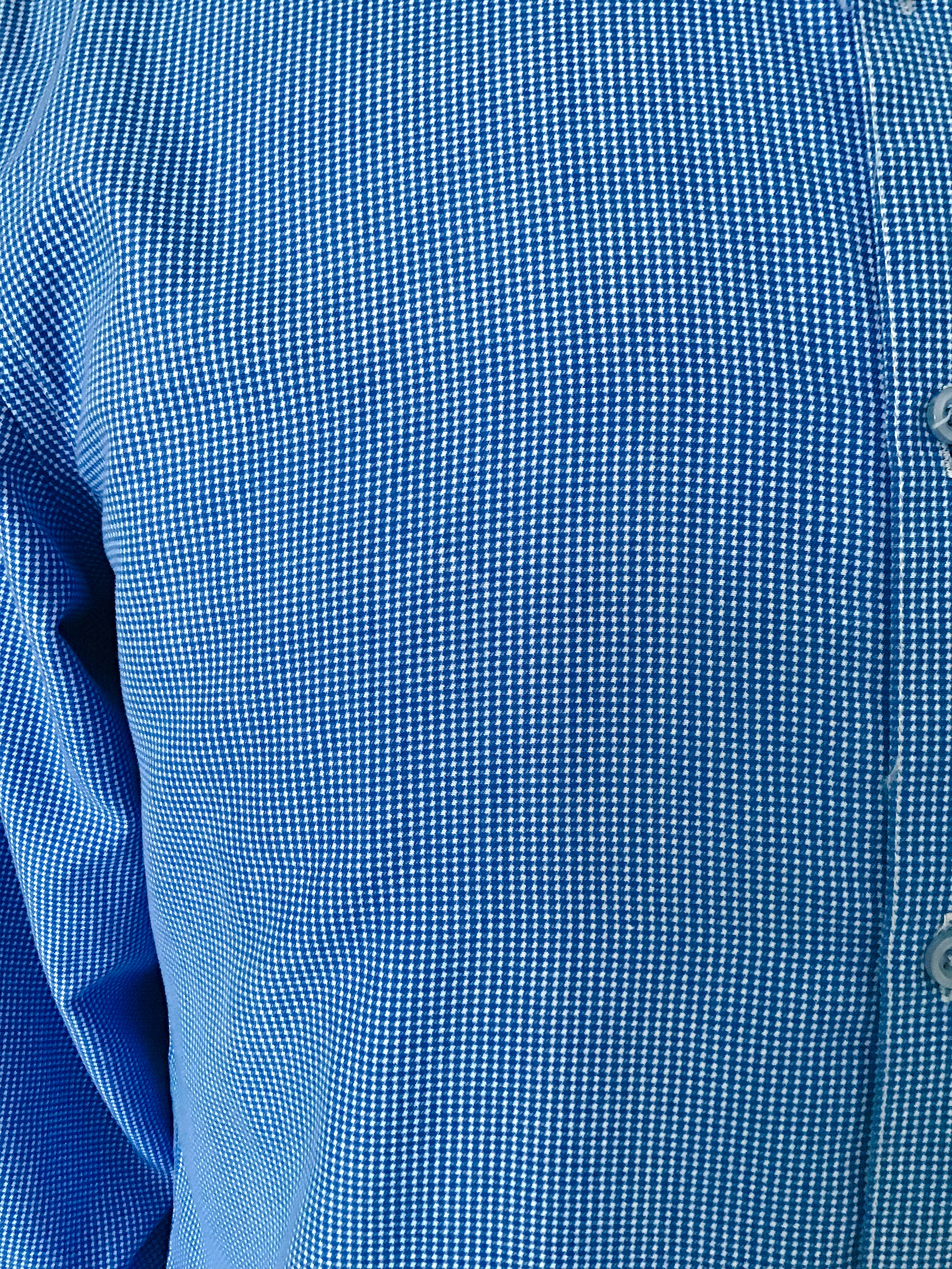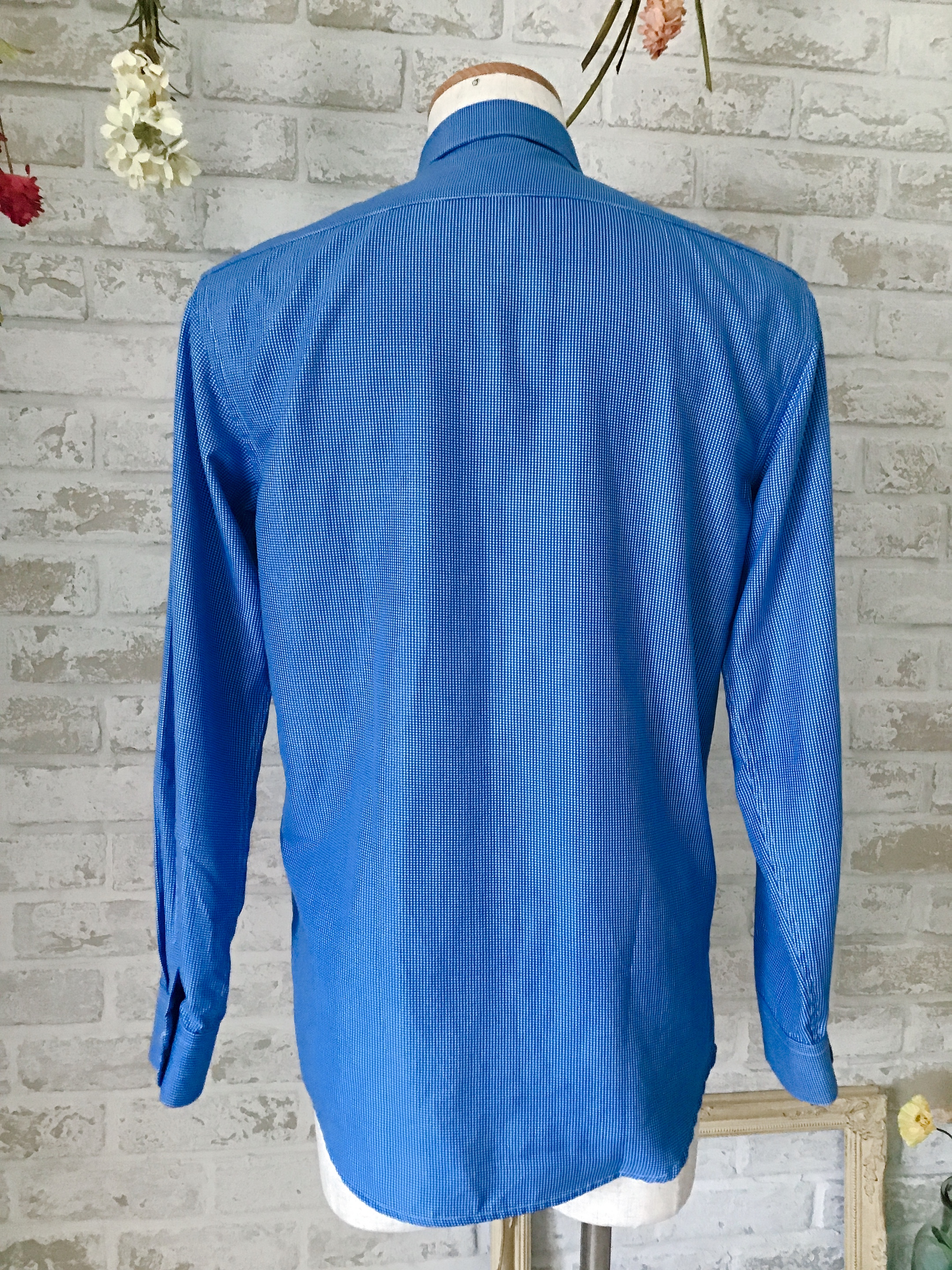 水色のような綺麗な明るいブルーです。とても爽やかな印象になりますし、ブルーなのでどんなカラーのスーツでも合わせていただけます。サイズはメンズSですが小さすぎないので、標準的なサイズとしても着ていただけます。
