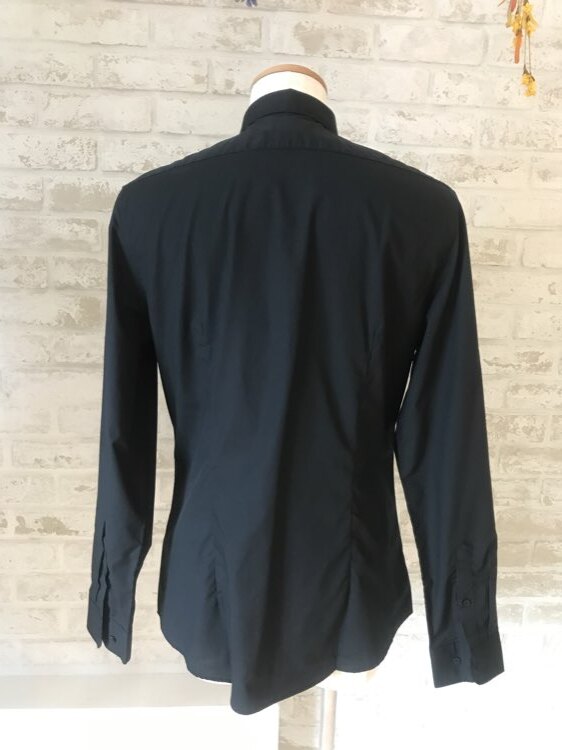 シンプルなブラックシャツです。どんなスーツにも合わせやすく、使いやすい一着です。結婚式などのフォーマルな時に活躍します。または二次会や同窓会などのスーツを着られる場合でもシンプルにまとめたい方にもおすすめです。サイズはLサイズです。平均的なLサイズのサイズ感で、ピッタリなのですっきりと着られます。サイズはM.Lのサイズ展開がございます。