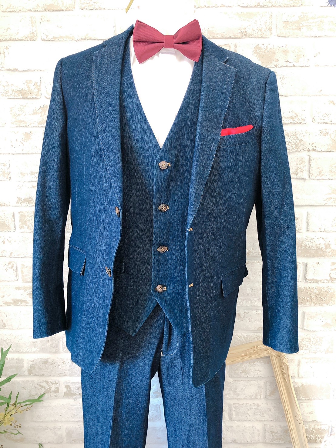 デニム生地のジャケットになります。他の方と被りたくない方、差をつけたい方などにおすすめです。カジュアルなため二次会やパーティ、ゲスト参列などにおすすめなジャケットです。ジャケットのサイズは34.36.40の3種類ございます。ダボ付きのないスタイリッシュなサイズ感です。