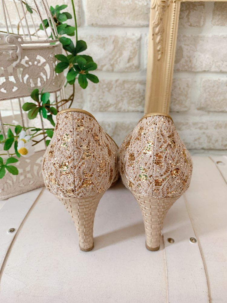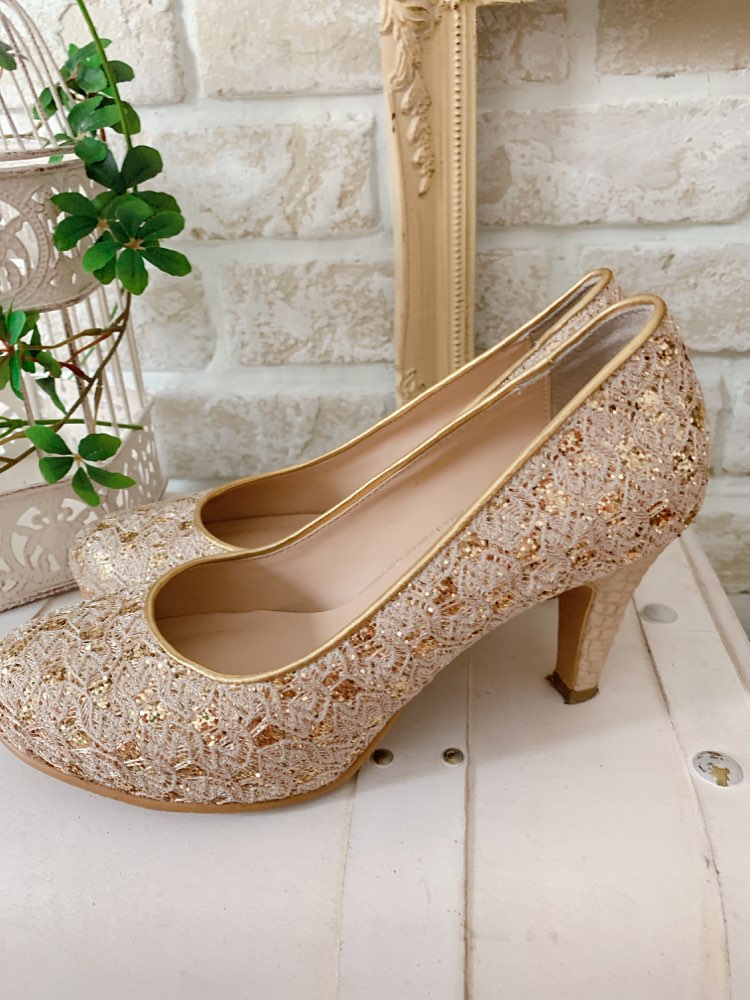 <商品詳細>ゴールドのラメが全体にあしらわれた、ゴージャスでエレガントなパンプスです。ゴールドカラーなのでどんなドレスとも相性抜群です。靴はどれにしようかな?と困った時にも安心です◎。パンツドレスと合わせれば、カッコイイ感じにも。しっかりとしたソールに、ポインテッドトゥで疲れにくいパンプスのひとつです。アクセサリーがゴールド系の時など統一感がでます。思った以上に肌なじみの良い色なので迷ったらコレ!とゆうくらいオススメの一足になっています。サイズ展開も豊富に取り揃えております。