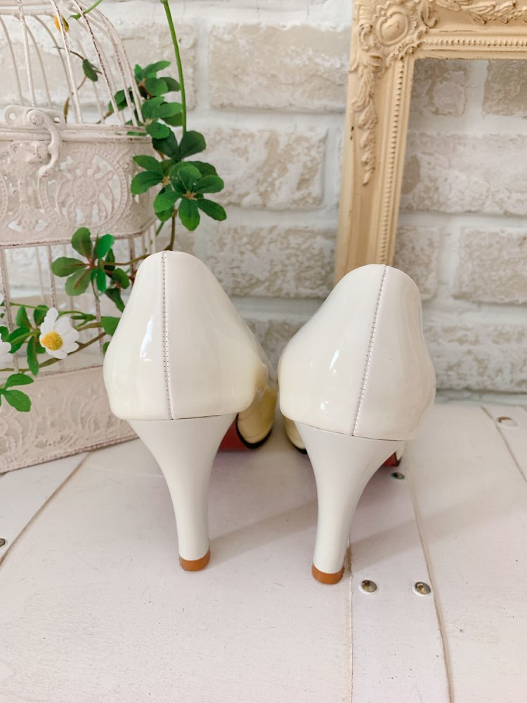 <商品詳細>ホワイトカラーの光沢のある、シンプルなデザインのエナメルパンプスです。花嫁さんだけの特権、白のパンプス。8㎝ヒールで、ソールも頑丈な作りになっていますので、普段あまり高いヒールを履かない花嫁さんにもオススメのパンプスです。トレーンの長いウェディングドレスでも安心して歩けます。もちろん、アンクル丈のウェディングドレスとも相性抜群!!シンプルで、歩きやすいシューズをお探しの方にはとてもオススメの一足です。