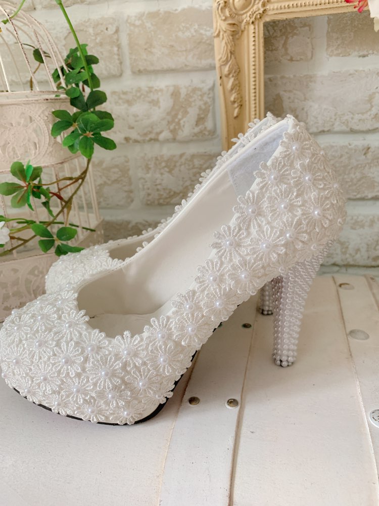 <商品詳細>ホワイトカラーに、パールとお花の刺?アップリケがデザインされたパンプスです。花嫁さん用のパンプス。ヒールは高めですが、つま先部分は厚底になっています。背の低い方やミニ丈のウェディングドレスの時など、いかがでしょうか。足を長く魅せてくれ、スタイルUPにもなります。とても可愛いデザイン、ヒールは高め。なシューズをお探しの方にオススメの一足です。