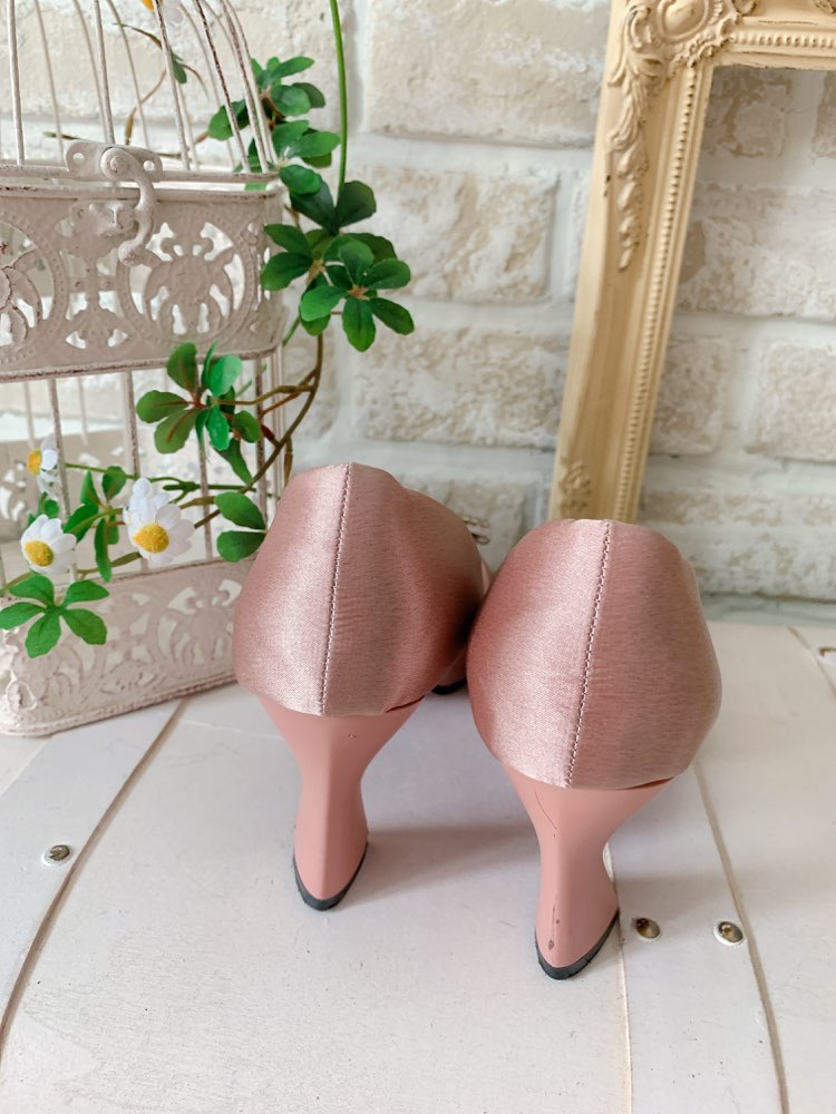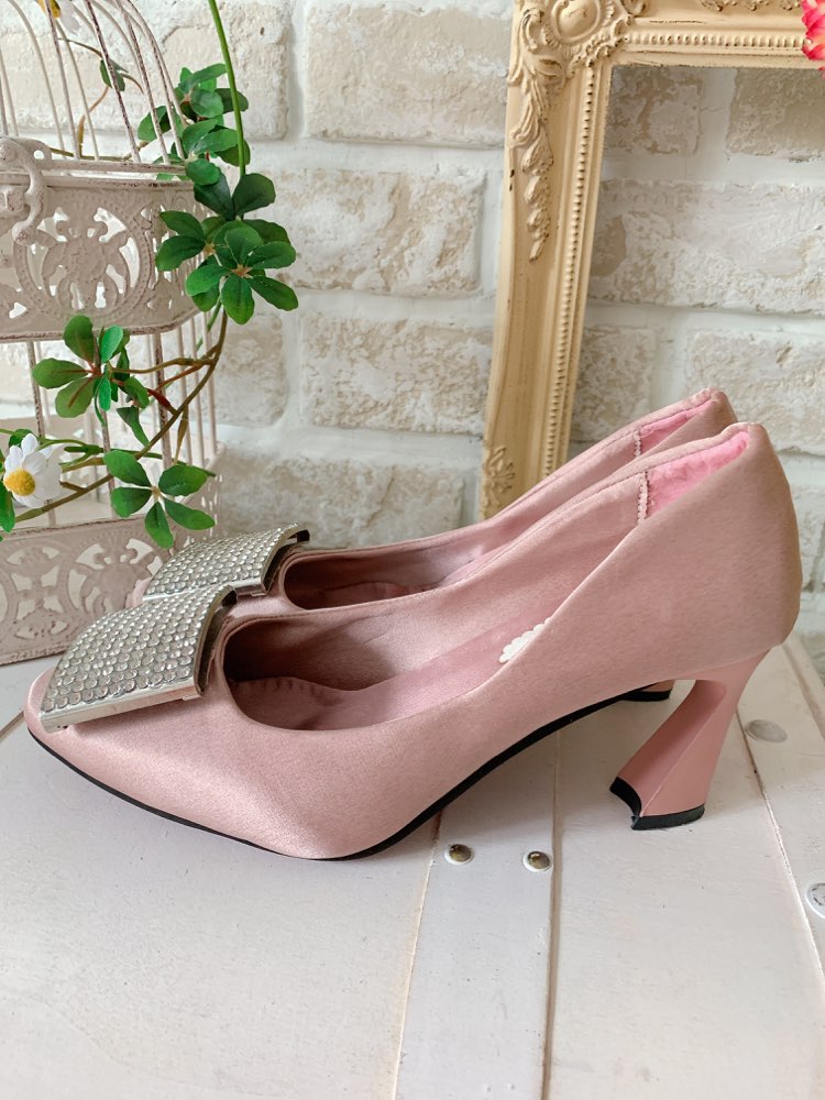 <商品詳細>大きなキラキラストーンがつま先に付いたベビーピンクカラーのパンプスです。