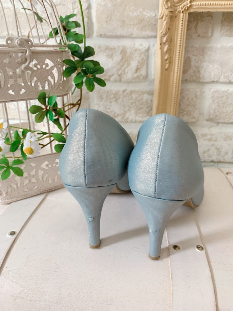 <商品詳細>取り外し可能なクリスタルビジューがついたブルーアッシュカラーのパンプスです。クリスタルが歩くたびにキラキラと眩い輝きをプラスしてくれます。グレイッシュカラーでどんなドレスとも合わせやすいのも嬉しいポイントです。アクセントカラーとして取り入れても、同系色カラーコーディネートとしても可愛い1足です。ブルーアッシュカラーが程よくエレガントさを演出してくれ、大人な女性にぴったりです!!ヒールの高さは女性の足を綺麗に魅せてくれる8㎝ヒール。ブルーが好きな方や、大人可愛い感じがお好きな方に是非オススメの一足になっています。