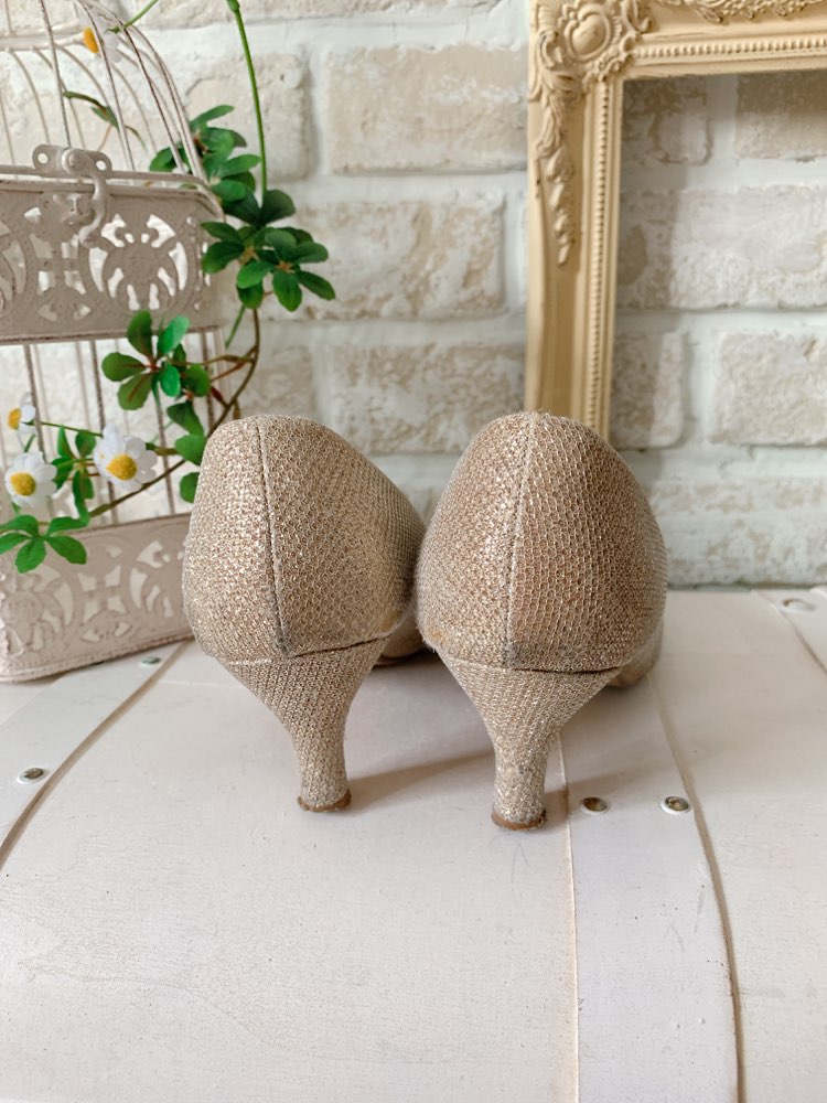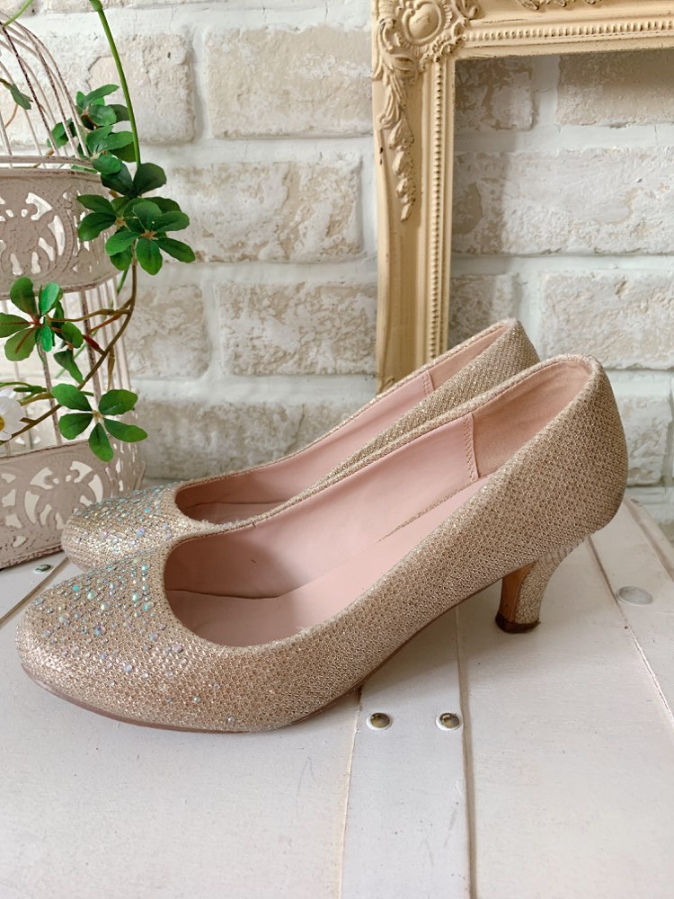 <商品詳細>ピンクゴールドをベースに、キラキラストーンがたくさん散りばめられた、パンプスです。
