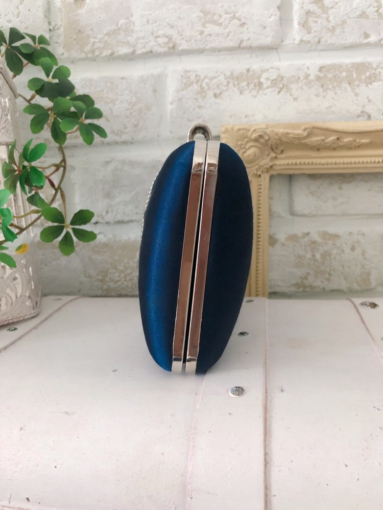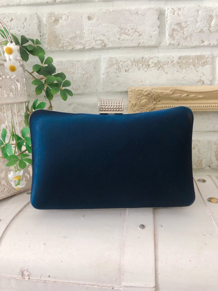 バッグ全体でリボンを表現♪ 女性の手元をフェミニンに演出してくれる、大人可愛いクラッチバッグの登場です!! 艶感のあるサテン地で高級感をプラス。中央にはストーンをふんだんに使用し、華やかでゴージャスな印象にしてくれます☆ 固めのしっかりとした形なので、格式高いお式でも使いやすいですよ! シンプルなデザインなので、多彩なフォーマルシーンで大活躍☆ チェーンは取り外し可能なので、クラッチだけでなく、ハンドバッグとしても使っていただけます。 艶感のあるネイビーのお色は、明るめカラーからダークカラーまで、どんなお色のドレスとも相性抜群!!