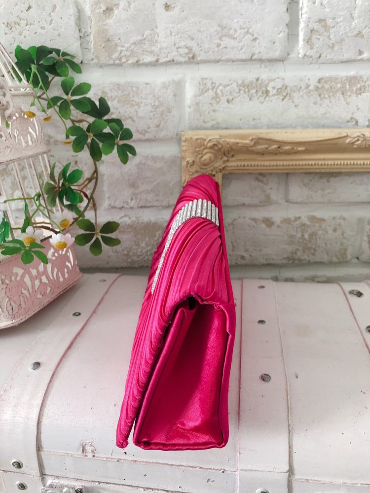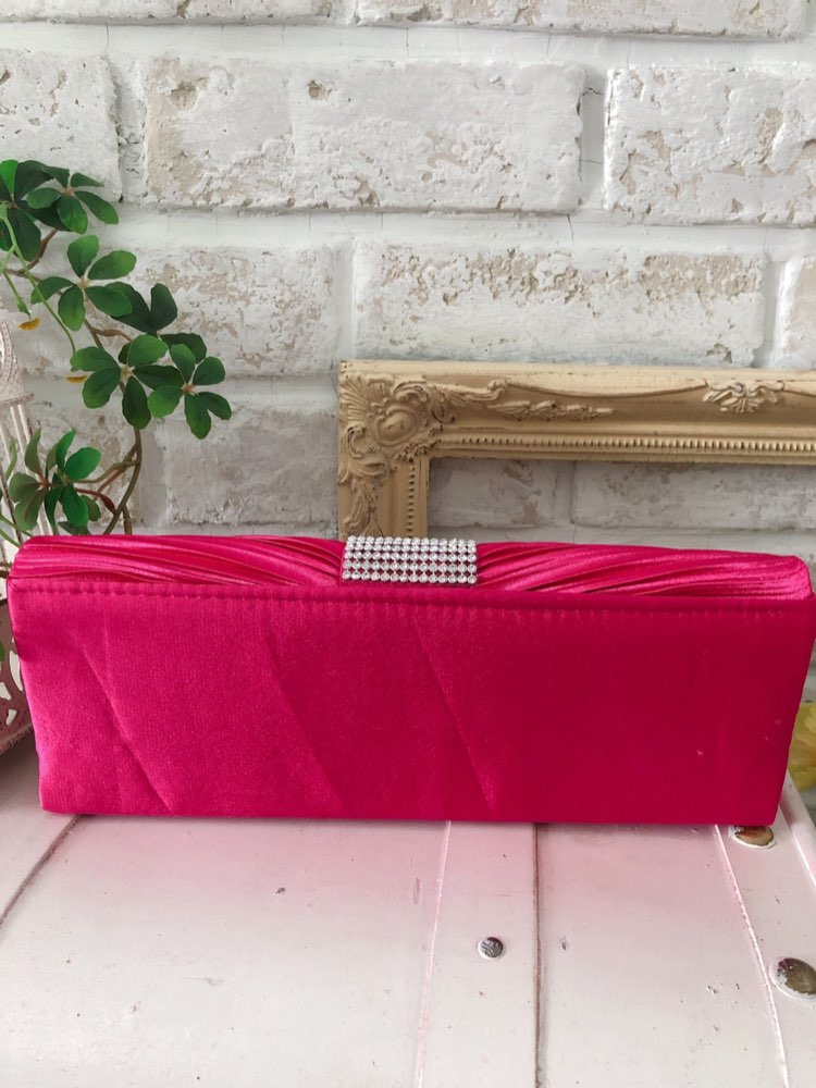大人可愛いクラッチバッグ。 艶感のあるサテン地で高級感をプラス。中央にはストーンを使用し、華やかでゴージャスな印象にしてくれます☆ 固めのしっかりとした形なので、格式高いお式でも使いやすいですよ! シンプルなデザインなので、多彩なフォーマルシーンで大活躍☆ チェーンは取り外し可能なので、クラッチだけでなく、ハンドバッグとしても使っていただけます。明るいローズピンクカラーはコーディネートのアクセントにも☆小ぶりに見えて、大きく開くマグネットタイプなので、口紅やファンデ、携帯も楽々収納の優秀さ♪