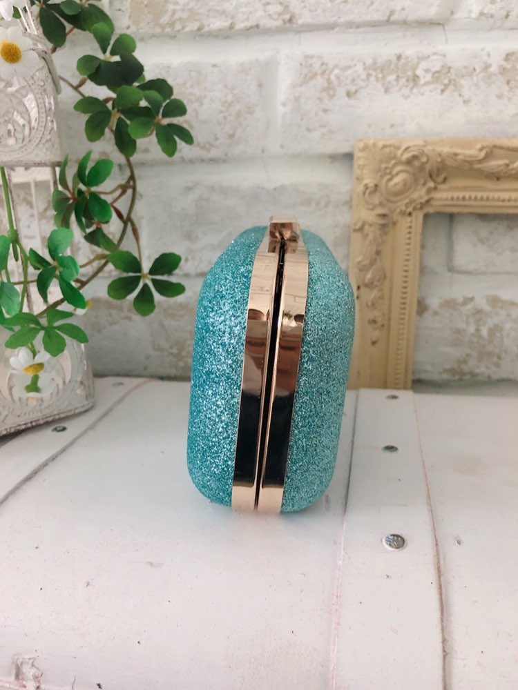 華やかでキラキラと光る水色のラメがエレガントなコンパクトバッグです。全体的に敷き詰めれれたキラキララメが煌びやかな雰囲気を放ち上品な演出を叶えてくれます。シンプルなドレスもゴージャスバッグをONすれば、華やかさとお洒落感をブラッシュアップ。 チェーン付きの2way仕様なので、利用シーンによって持ち方を替えられるのも嬉しいポイントです。 クラッチタイプとしても、付属のチェーンを付けてもOK。 結婚式やパーティーのお呼ばれ、同窓会などのお出掛けにぜひご利用ください