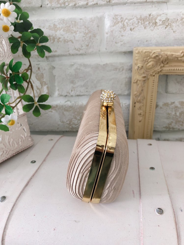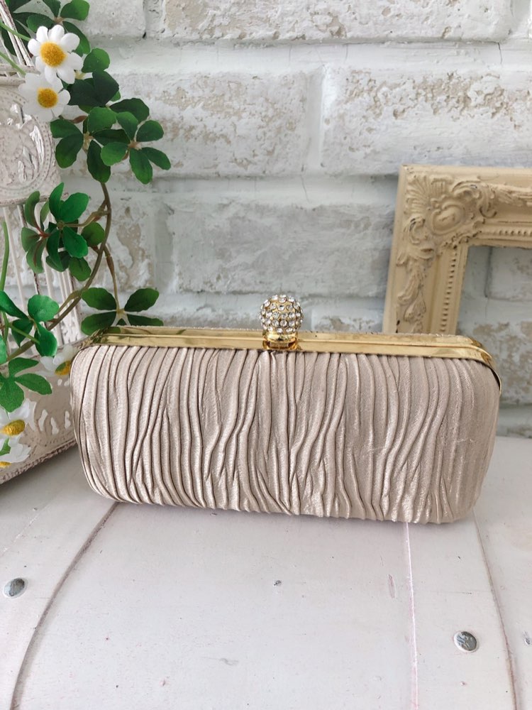 ドレスコーディネートの脇役にふさわしいカラーのパーティーバッグ。細かなギャザーデザインバッグは、品があってとってもエレガント。クラッチバッグとしても、チェーンを持って通常のパーティーバッグとしてもGOOD。 装飾が少なくシンプルな分、メーンのドレスは柄物でもシンプルな物でもマルチにコーディネートを引き立ててくれる優れもの♪ シーンや年齢問わず、安心してお使い頂けます。 定番のシャンパンゴールドカラーバッグは、あらゆるコーディネートをシックにまとめてくれますよ。