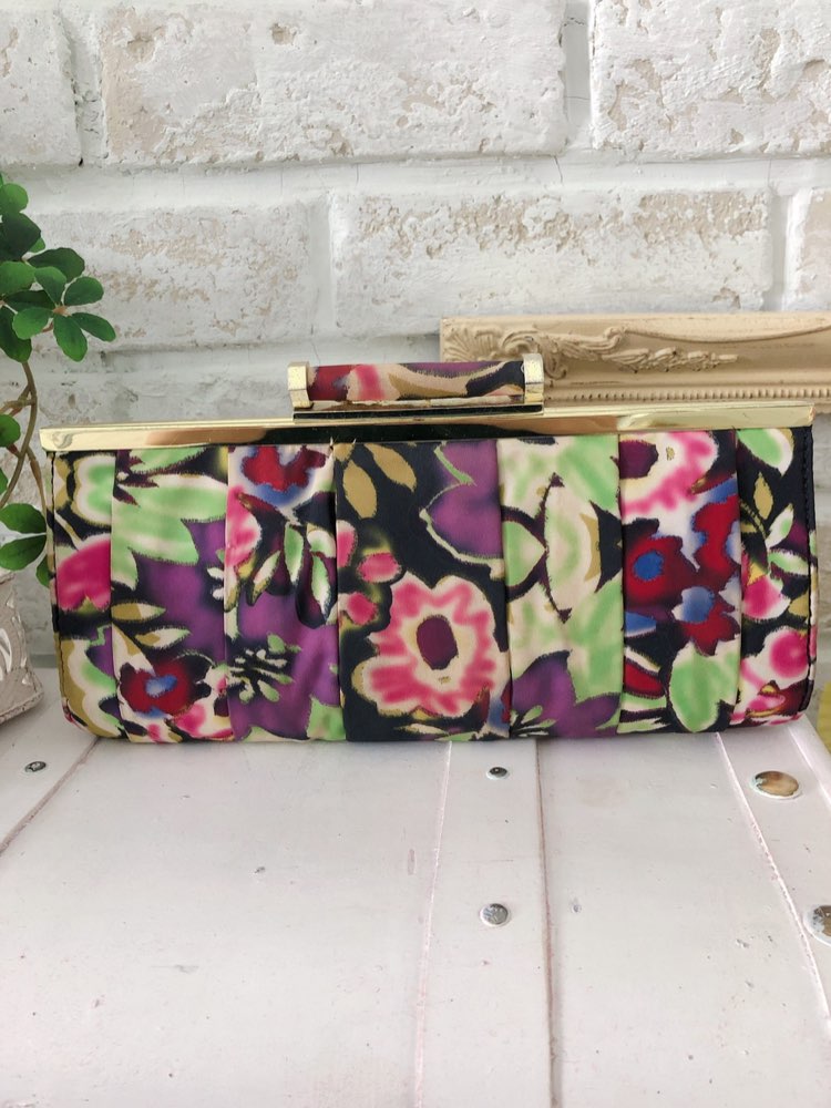 お花のプリントは様々な洋服のアクセントバッグになり重宝します。華やかなパーティシーンでもデートシーンでも多様な場面で使えるので◎ダークなトーンの上に咲く大輪の花は大胆さもあるけど、大人の女性らしい逸品。