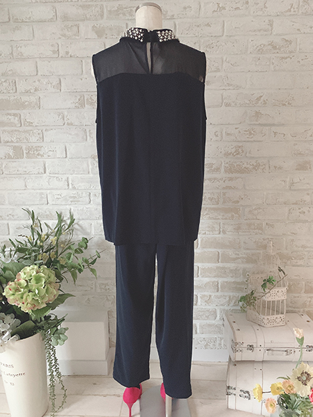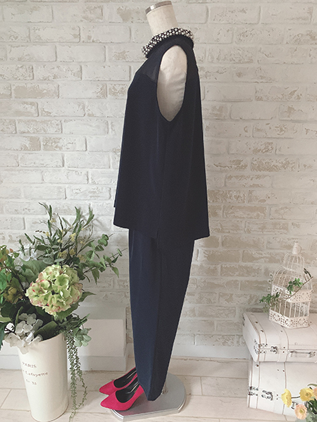 首元にデザインされたビジュがまた可愛く、パンツスタイルなので可愛くなりすぎず大人っぽく、プラス華やかに着ていただけるパンツドレスかと思います。色味はネイビーなので、派手過ぎません。とても上品で、小物を合わせるのであれば、ピンクや赤と言った濃いカラーと相性ピッタリかと思います。