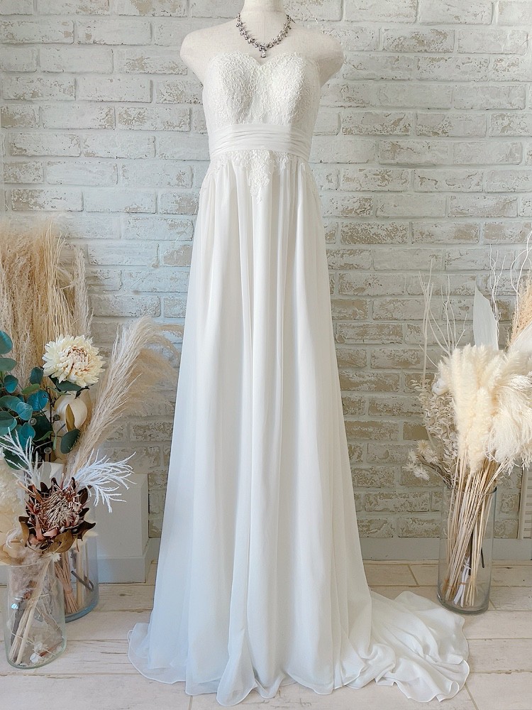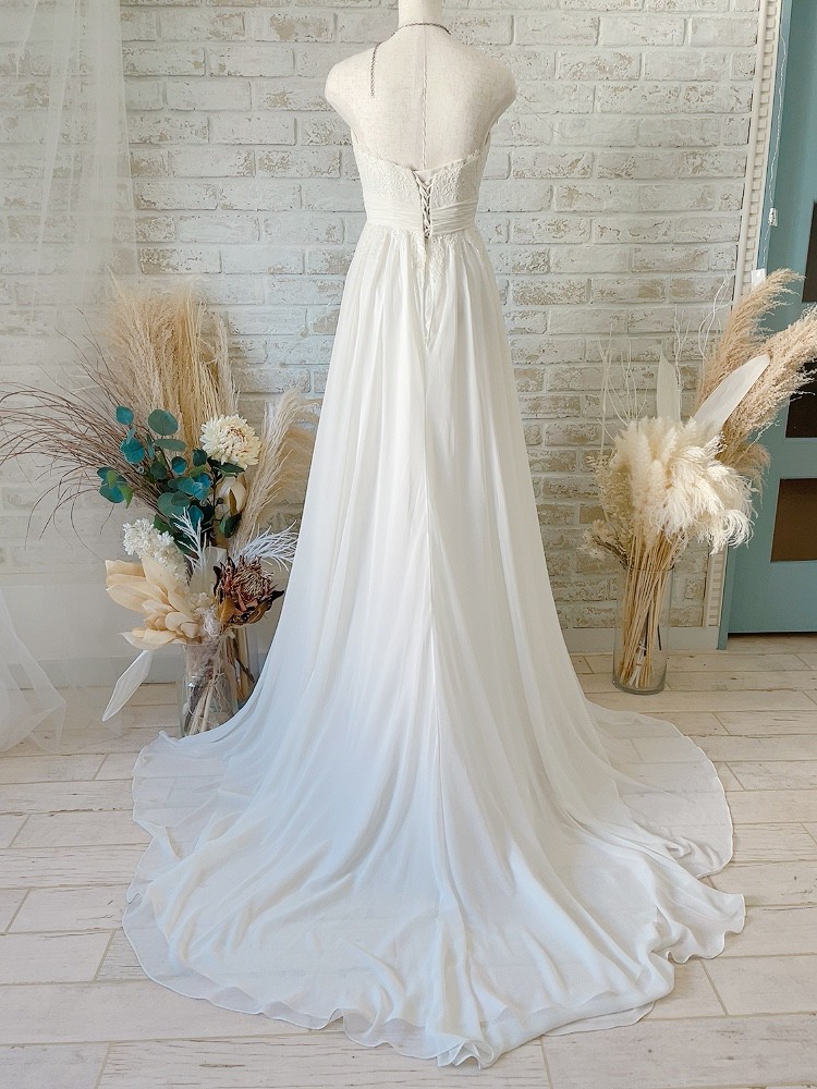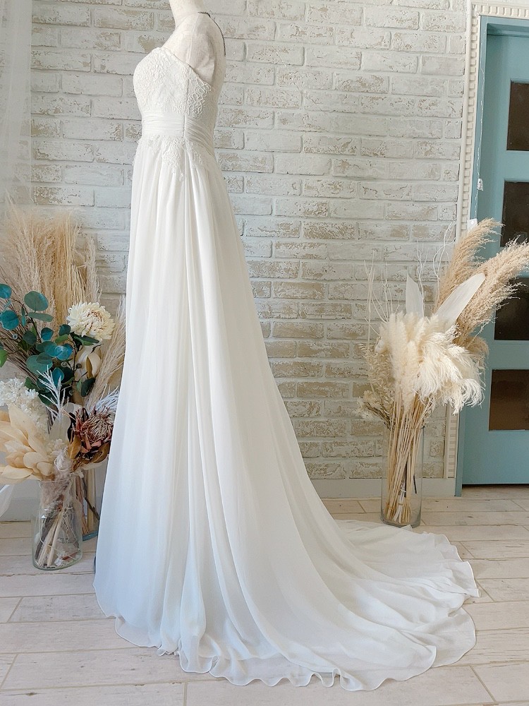 トレーンの長めの胸元にはレースが施され、スカート部分はシフォン素材のエンパイアラインのウェディングドレスです。トレーンの長さは新婦の従順な心や格調の高さを表す。と言われています。トレーンがながいため、チャペル式など大きな教会での着用がオススメです。品格のある美しいデザインのウエディングドレスです。