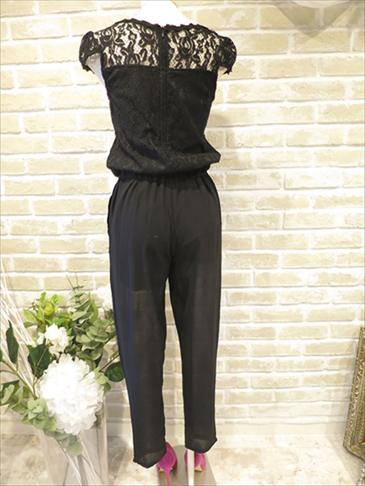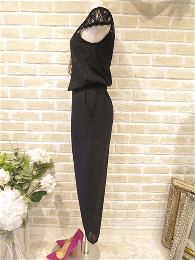 ブラックのパンツドレスです。肩をあまり出したくない&スカートが苦手な方にオススメです!肩がレースデザインになっていてキュートな印象もあります!シンプルに派手過ぎずに行きたい方にはオススメですし、何かポイントを足したい方は、明るめの色味のバッグだったり、大きめのネックレスをオススメします!