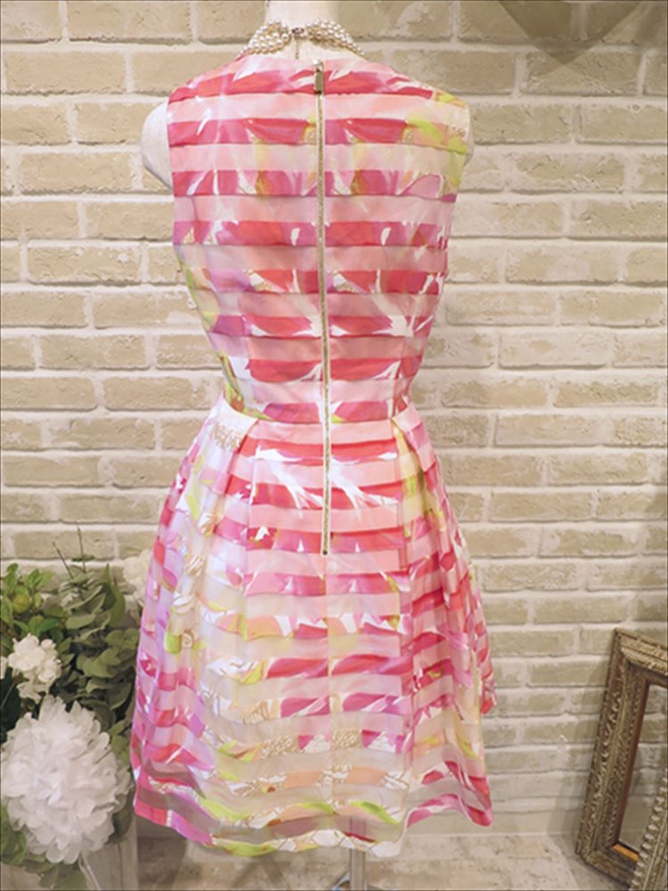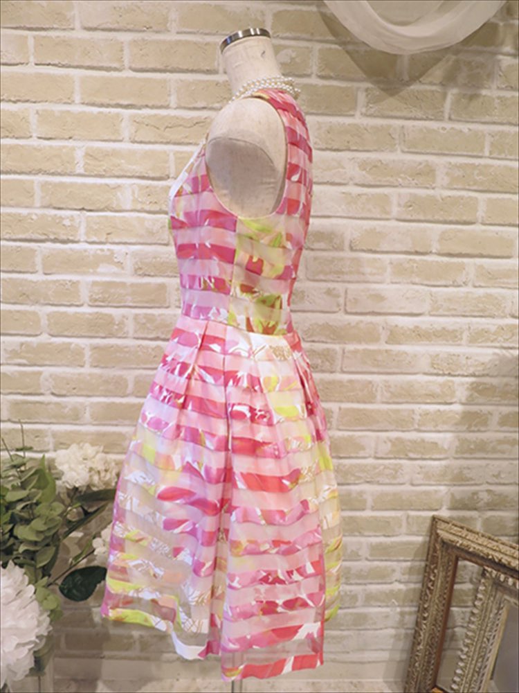 ピンクとシースルーになっている、ボーダーが可愛いドレスです。春先~夏にぴったりのドレスです。花柄になっていますので、とてもフェミニンな雰囲気になります。白系のパンプスを合わせますと清楚な感じに。同系色のパンプスを合わせますとハイセンスな感じになります。アクセサリーは控えめな華奢なものがオススメです!
