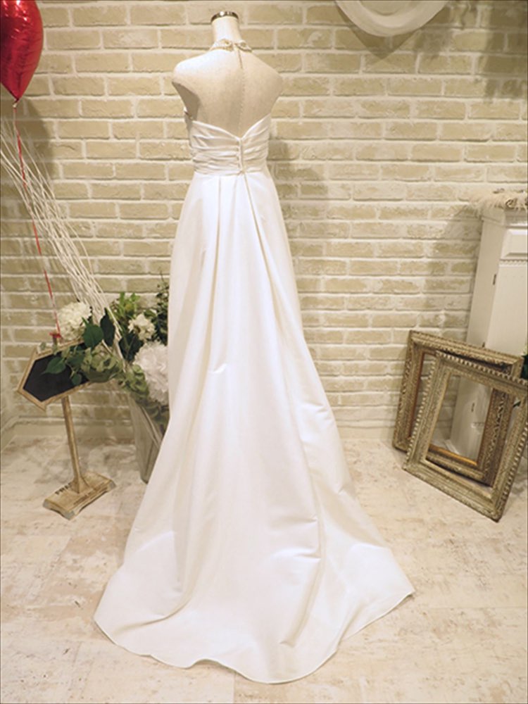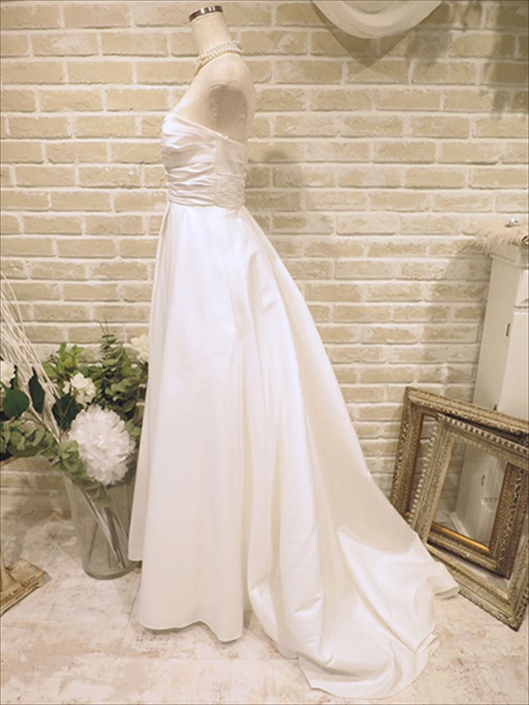 タフタ素材とゆう、少し固めの素材のおとなしめAラインウエディングドレスです。秋頃~春の寒い時期辺りにオススメなドレスです。高級感のある素材ですのでアクセサリーも豪華なものがよくお似合いかと思います。胸元はハートカット風になっていてデコルテラインも美しく演出してくれます。高級感のある会場にも負けないくらい華やかでシンプルなデザインのウエディングドレスです。
