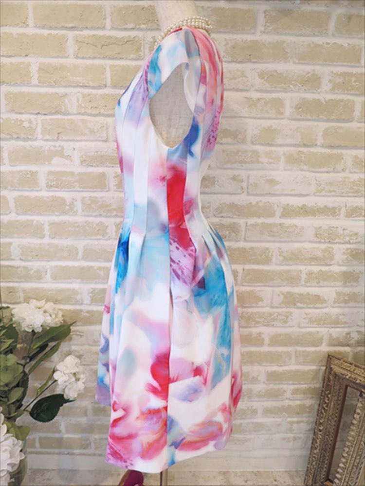 白地にカラフルな模様の個性的なドレスです。パーティーなどで着ていたらとても注目されそうなドレスです!雰囲気を明るく行きたい方にオススメで、色合いも柄もとても女性らしい1着となっております!半袖なので1枚で着てもありですし、ストールで合わせていくのもありです!