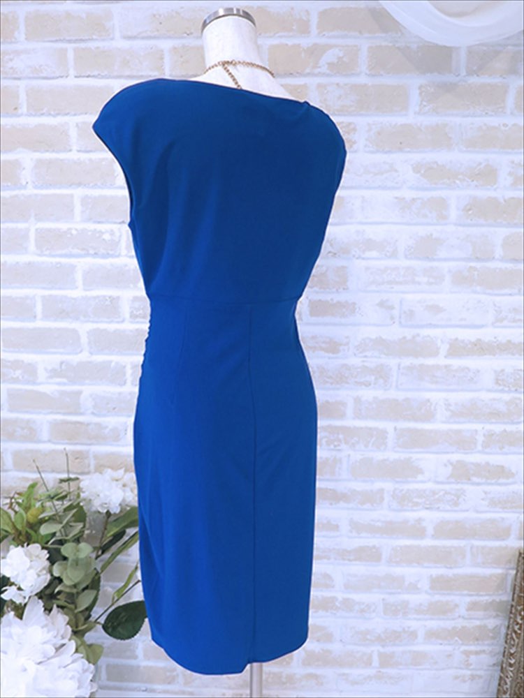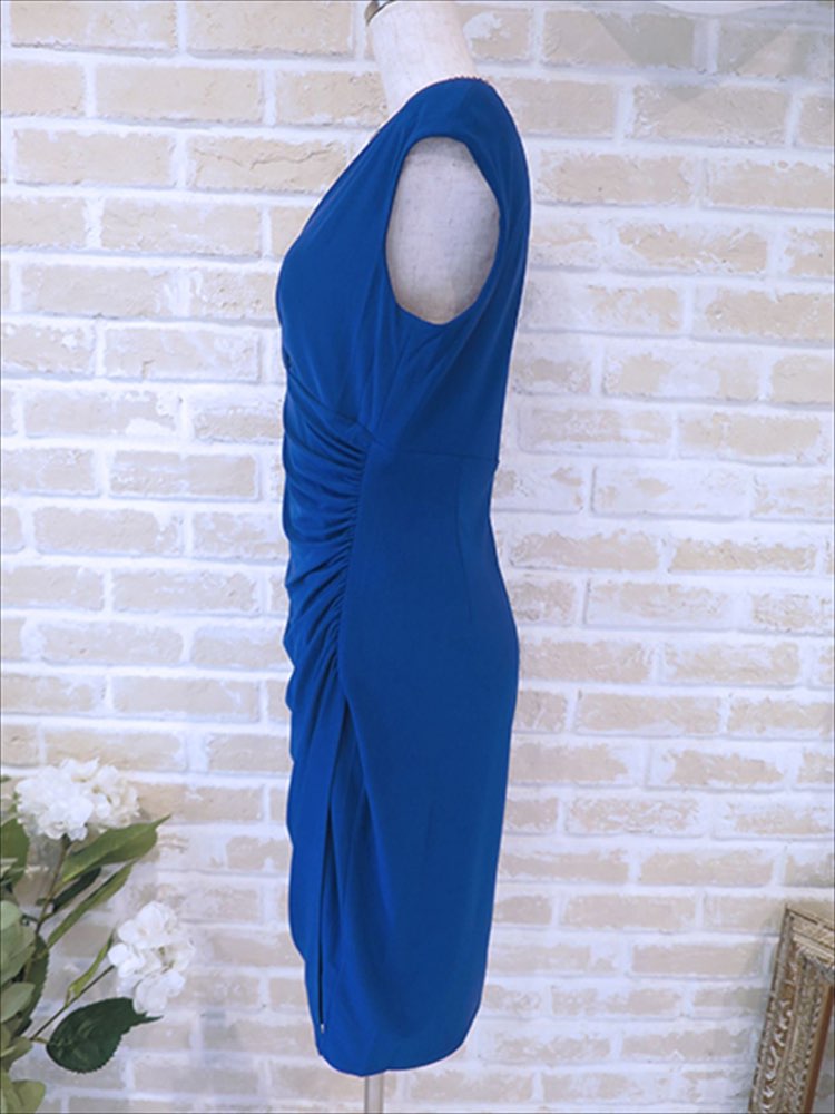 ブルーのタイトドレス。Vネック型なので胸元が少し見えてセクシー感のあるドレスです。少しクシュッとしたデザインがポイントで、キレイめの大人の印象を与えます!ピタッと肌にくっつくような素材ですが、伸縮性もありきつくなりません。ブルー1色というシンプルな良さもあります!