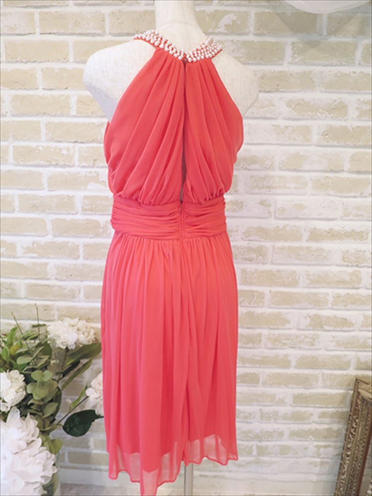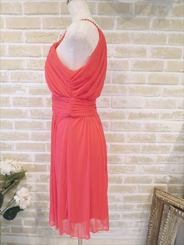 137の色違い。ピンクのアメリカンスリーブ型ドレス。ピンクで目立つうえに、首元のパールがポイントになり、とても華やかなドレスです。二次会に最適です。レッドよりのピンクといった優しいお色味で、派手は派手でも着こなしやすいお色味だと思います!