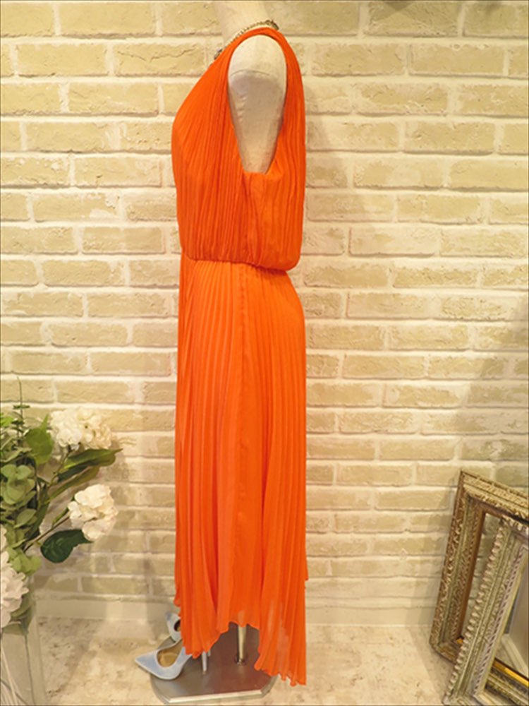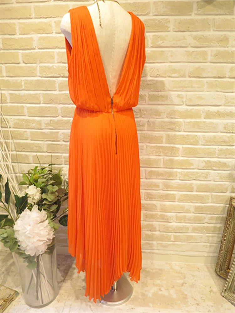 胸元と背中の開いたオレンジのドレスです。明るいオレンジがとてもキレイです。胸元と背中が大胆に開いているデザインなので、パーティーなど派手に行きたいなという方にオススメです!1枚で着ても、ボレロを羽織っても存在感は絶対にでること間違いなし!丈間も膝より長めの丈なので、足をあまり出したくないなという方にはオススメの1着!