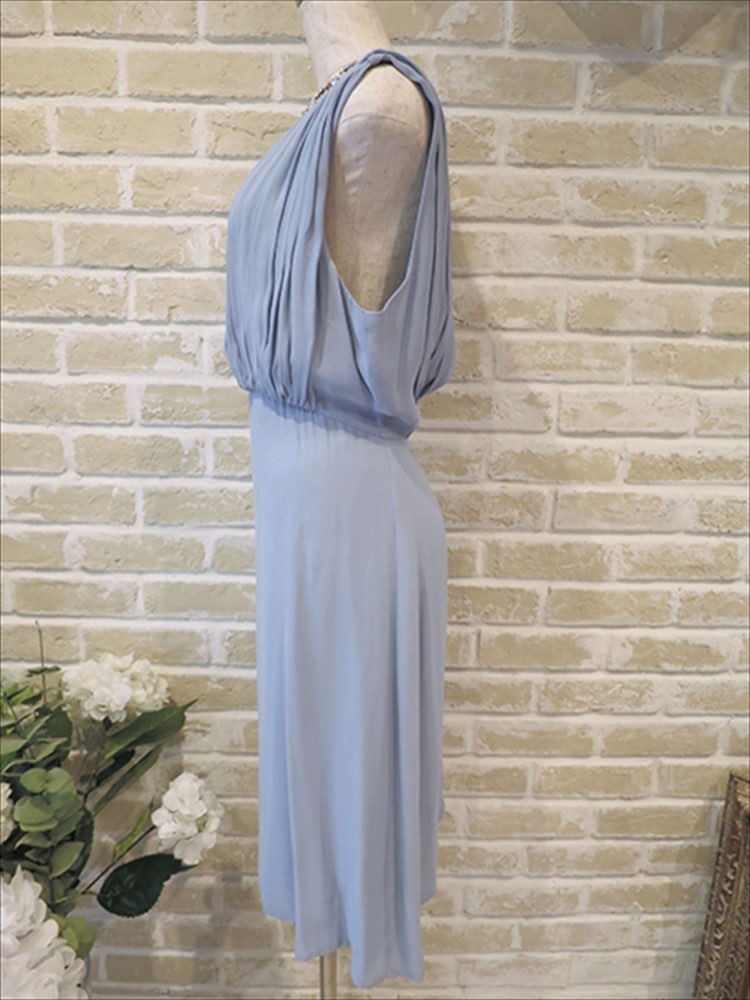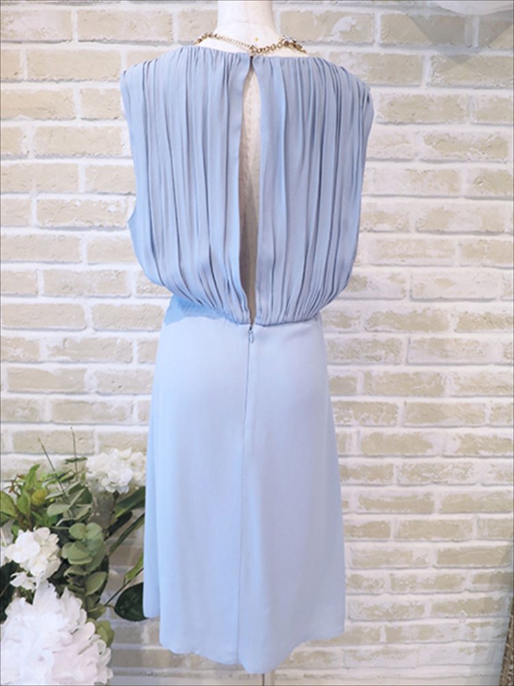 動くと背中がチラッと見えるデザイン。少しだけ見えるところがとってもかわいいです。レースなどのインナーと合わせてもいいと思います。お色味も優しい水色で派手過ぎません。年齢問わずで女性らしく着ていただけるアイテムとなっております。上が少しクシュッとしたデザインがはっており、下はタイト型です。大人な女性という印象と与えます。