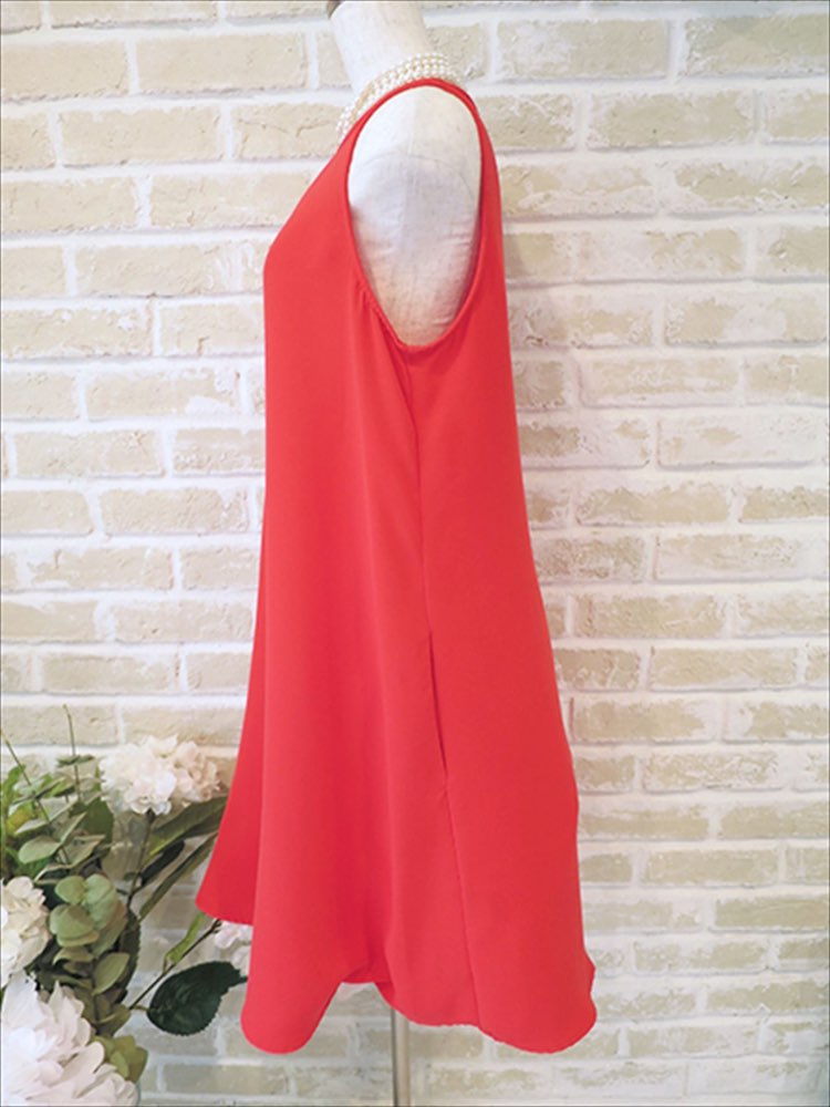 オレンジっぽいピンク。サラッと着るカジュアルでシンプルなドレス。お食事、女子会にピッタリです。1枚で着ても存在感抜群ですし、とてもシンプルですが濃いお色味なので若い女性の方にピッタリ!元気な印象を与えてくれるアイテムです。