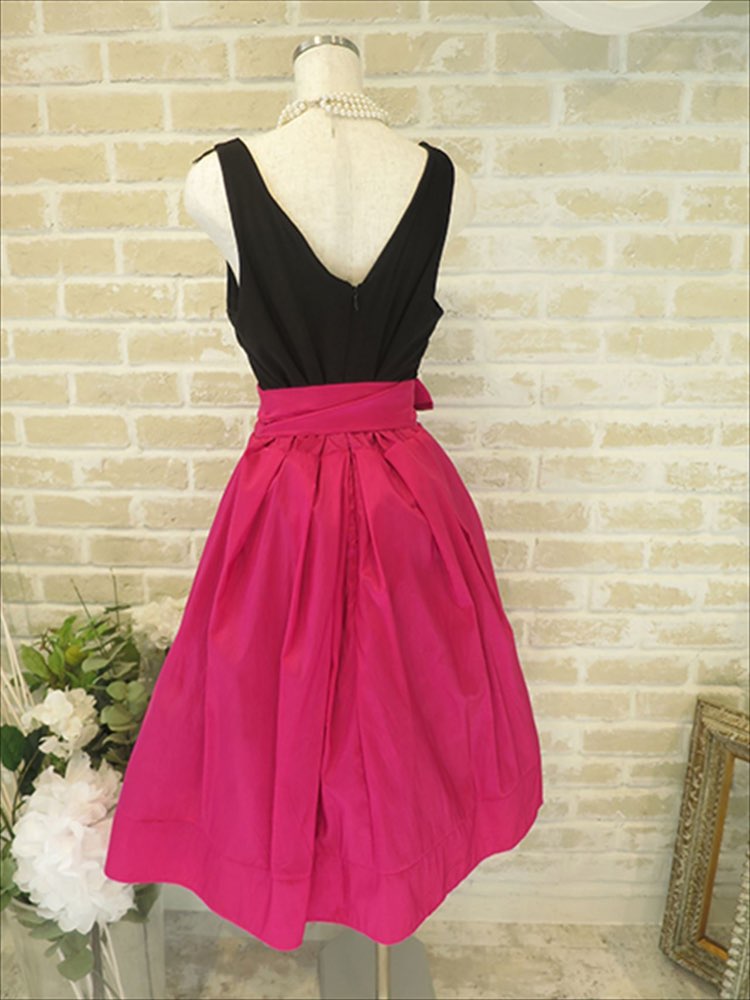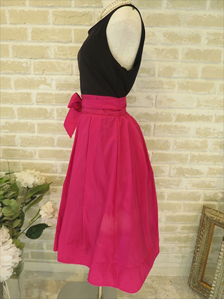 ウエストのリボンからカメリアピンクで可愛くもシックも両方兼ね備えたミニ丈のAラインドレス。合わせる小物や羽織もので全然印象が変わるドレスです。ウエスタンラインからスカートがふわりと広がるデザインとなっていますので、体型カバーも叶えてくれます。同じ色のパンプスを組み合わせたコーディネートもオススメです。