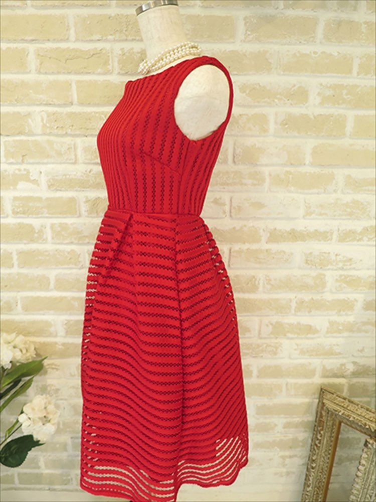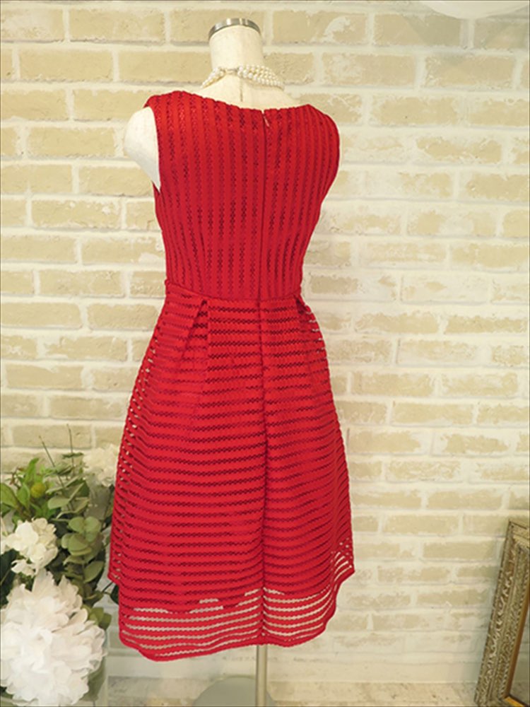 厚手のしっかりした生地の、赤の発色がとてもきれいな海外商品ならではのドレスです。ボーダーとストライプがウエストから切り替わっていておしゃれです。膝あたりは若干シースルーになっています。とてもきれいな赤色なのでリゾートウエディングなどで特に映えそうな一着。アクセサリーをシンプルにしてドレスを引き立てるコーディネートがオススメです。