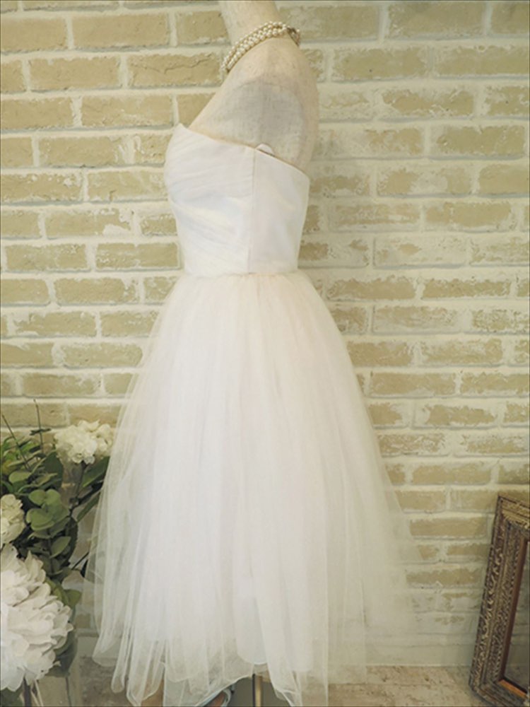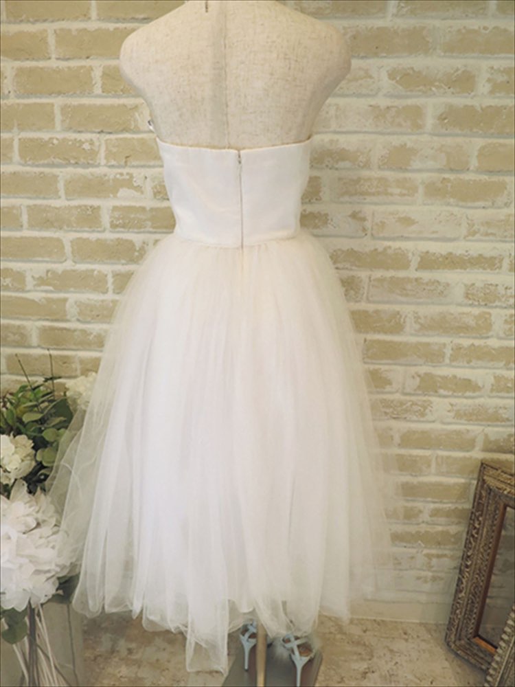 ミモレ丈のチュール素材がキュートな雰囲気を演出してくれること間違いなしのウエディングドレスです。ミモレ丈なので、歩きやすく、よく移動するシーンでは大活躍致します。 ベアタイプのチュール素材、Aラインに女性らしさUP、キュートな雰囲気と王道ドレスです。 こちらのドレスはガーデンウエディングなどよく動き回るウエディングスタイルの時や、結婚式二次会、1.5次会などに特にオススメです。