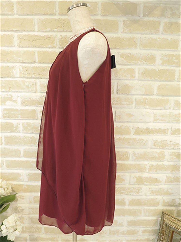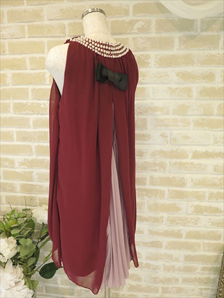 色違いでブルーがあります。後ろにリボンがついていて、その下から薄いピンク色の生地が見えて上品さのあるドレスです。首元にはパールがついていて、ネックレスが無くても着こなせるアイテムです!色はレッドとありますが、派手なレッドというよりかは、暗めのレッド。ワインレッドに近いものでございます!