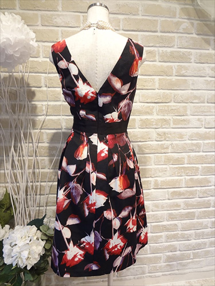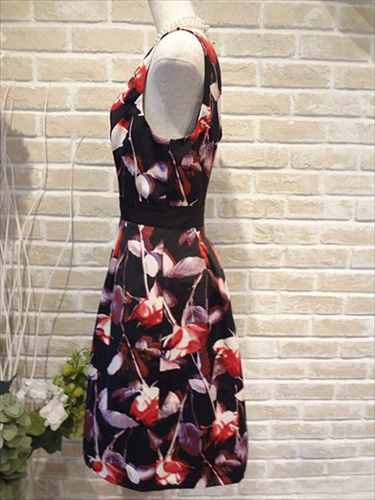 柄の肩ありドレス。黒や赤・白など様々なカラーがプリントされいるドレス。ドレスにふくまれているカラーをバックに合わせて頂くのがお勧めです。ウエストはゴムになっておりますので調節しやすくお客様のウエストにフィットするデザインとなっております。着丈も短すぎず、安心して着て頂けると思います。羽織ものは黒で合わせられてもいいですがベージュ系のボレロも合います。アクセサリーはパール系のネックレスなどを合わせて頂くと上品なコーディネートになります。靴はピンクや紫などでで女性らしい上品なコーディネートになります。