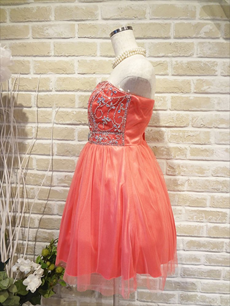 明るいピンクボリュームスカートベアドレス。胸元とウエストのビジューが可愛い1着。明るいピンクのおドレスなため、パーティーや謝恩会に是非着て頂きたい1着。海外から買い付けているドレスなため他の方ともかぶらず着て頂けるデザインです。スカート部分はバルーンになっており、ふんわりとボリュームがでるのでラインも大変綺麗です。またウエストもしっかりと絞られているのでウエストラインもしっかりとでます。