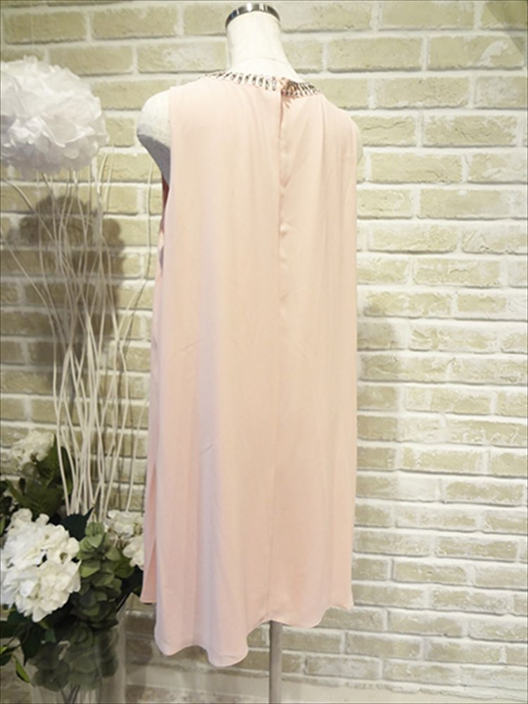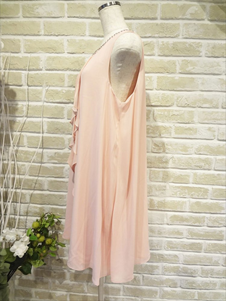 薄ピンクのフリルドレス。さらっと1枚で着られるデザインで、首周りのビジューとフロントのデザインが可愛いです。こちらのドレスは結婚式・パーティー・お食事会等幅広いシーンでお使いいただける上品な一着です。ストンと落ちるシルエットはどこかナチュラルな、抜け感を演出してくれます。ストールをさらっと羽織って頂いても素敵です。首元は思い切ってノーアクセサリーで着て頂くか、ドレスの上に重ねるようにデザイン性のあるネックレスを合わせるのがお勧めです。様々なシーンで使えるドレスです。