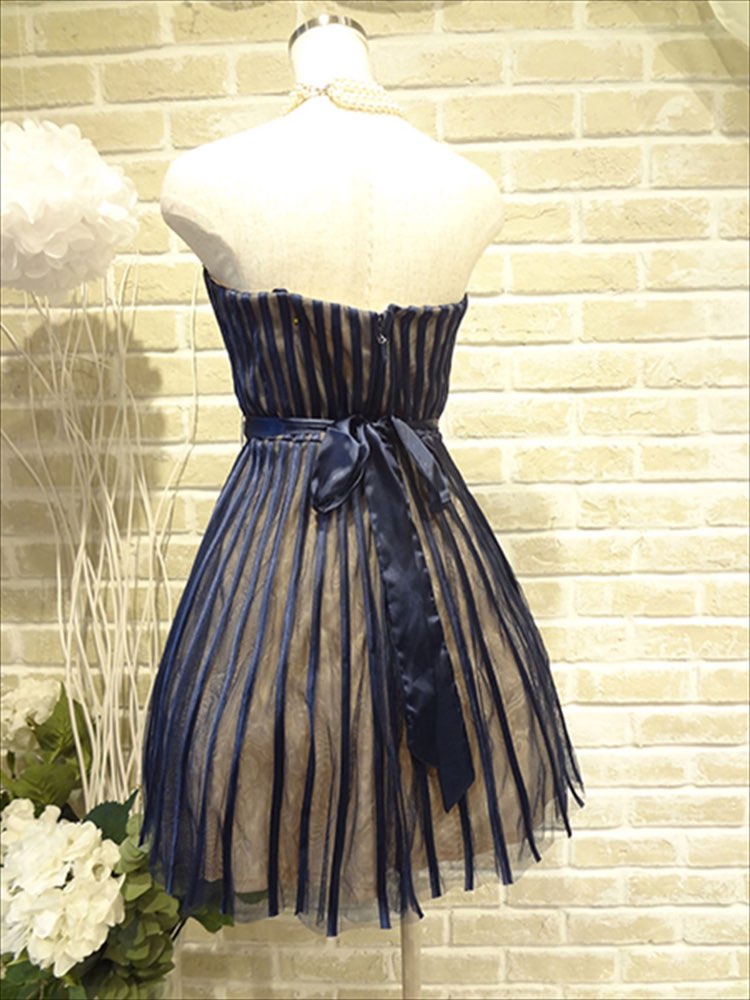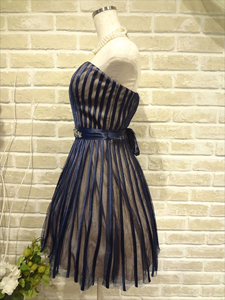 ストライプ柄のチュールついたベアドレス。ウエストのビジューベルトがウエストラインを綺麗に魅せてくれてます。ネックレスはパールやゴールドなど選ばず合わせていただき、バックや靴はベージュなどで大人っぽい印象にしても良くブルーなどの同系色で合わせてコーディネートしても可愛いです。