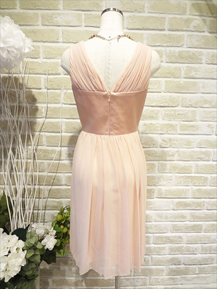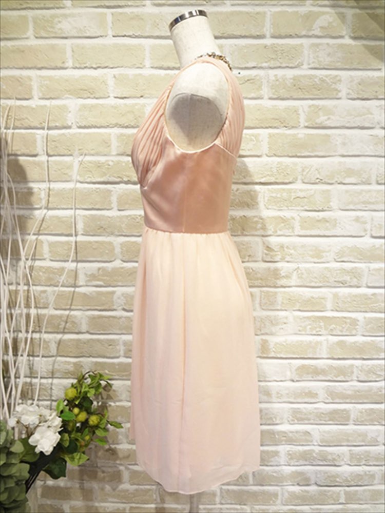 前も後ろもVカットのドレス。ウエストマークがしっかりしたデザインで淡い色のワントーンでも綺麗に着ることが出来ます。アクセサリーはゴールド系で華やかにして、靴やバックの小物はベージュ系で同系色でまとめても可愛く、黒やビビットカラーでポイントを入れてもかっこいい印象で着れます。派手ではないカラーのため、結婚式や謝恩会、パーティなど様々なシーンで着ることが出来ます。