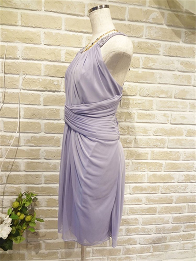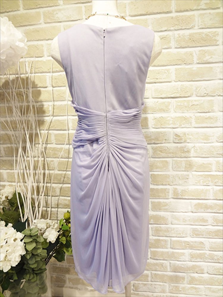 ライトパープルのドレス。シンプルなデザインですがあまり見かけない綺麗なカラーで、周りの目を引きます。デザインが凝っているのでネックレスは小ぶりなもので、ピアスは大振りだととても綺麗にドレス目立たせてくれます。バックや靴はビビットカラーでポイントを入れても可愛いですが、ベージュやライトブルーなどの落ち着いたカラーを合わせても上品に華やかにまとめても可愛いです。