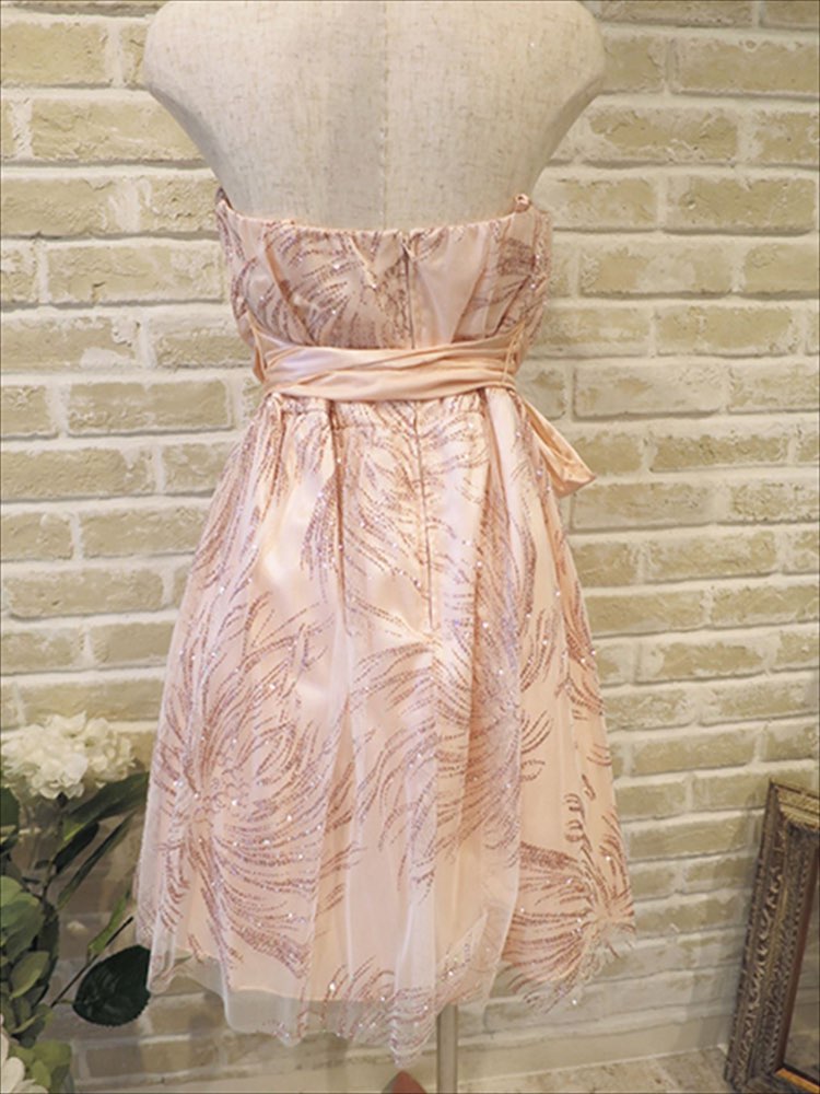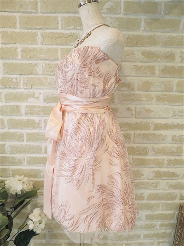 ラメデザインのピンクベージュのベアドレス。程よい華やかさです。パニエをはいてボリューム出してもかわいいです。腰についているリボンがポイントで、とても優しい色味かつ、リボンでスタイルアップをさせてくれる女性らしいドレスとなっております。