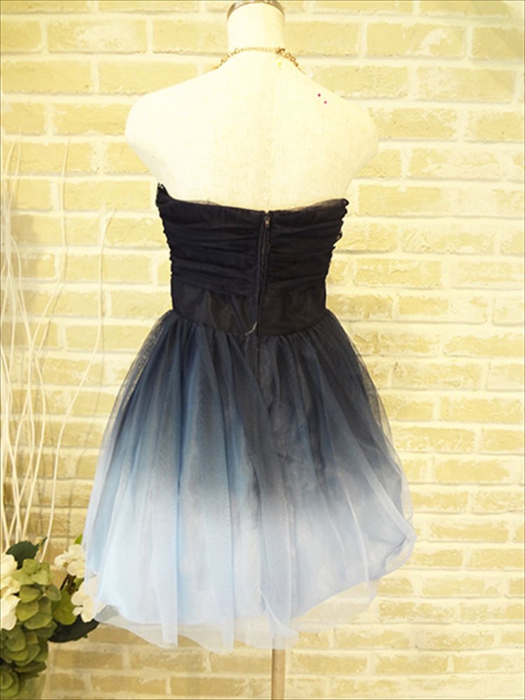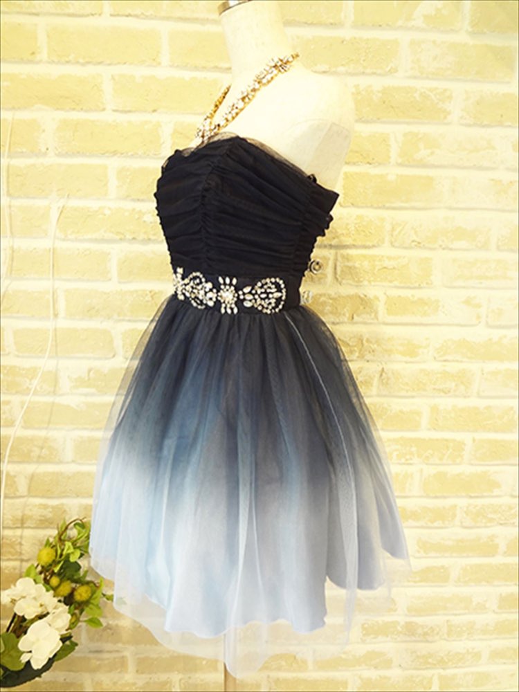 ネイビーからブルー系へのグラデーションが綺麗で、あまりない個性的なドレスです。柄が無くシンプルですが、ウエスト部分にビジューがついていることで華やかさを持たせてくれます。また、ウエストの切り替え部分が高めにあることで脚長効果があります。中にパニエを履いていただいてボリュームを出しても可愛いです。