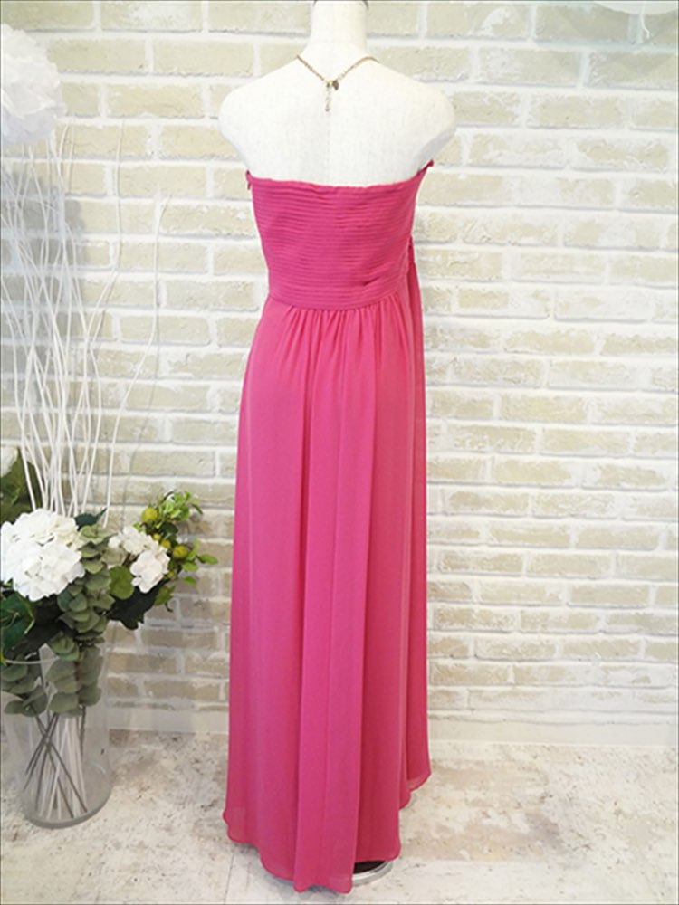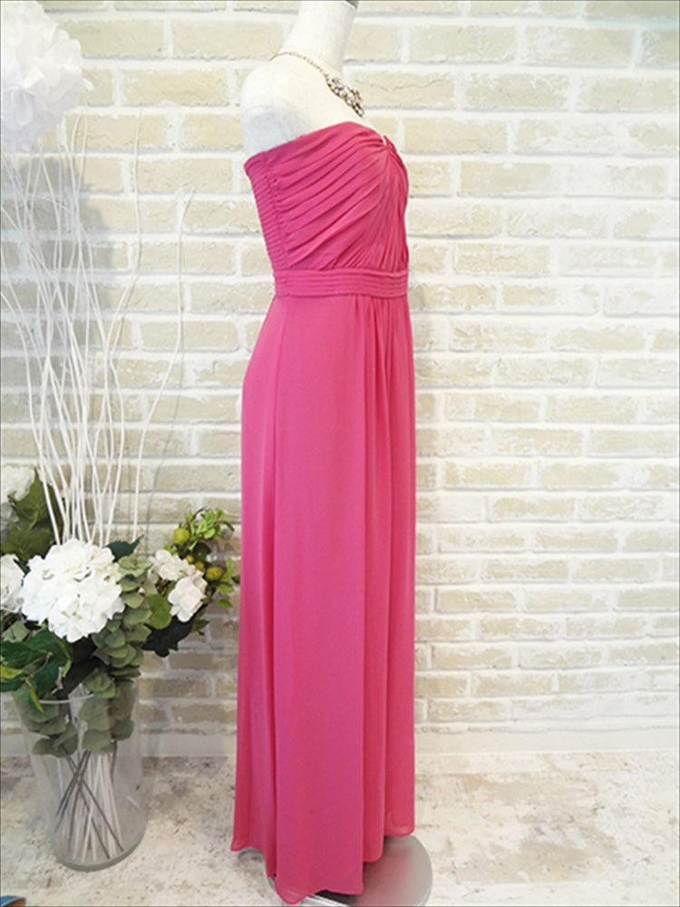 ベアタイプのドレスなので首元が大きく開いており、デコルテから女性らしいラインをアピールできます。色がマゼンダピンクとなっており、明るい色なのでとても華やかに可愛く着ていただけるロングドレスです。高めのヒールをはいていただいてスタイルアップできます。切り返しがあるので上下のメリハリもついているものになっています。