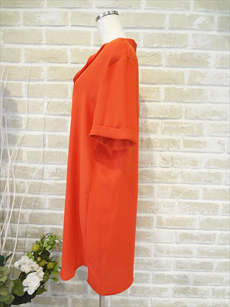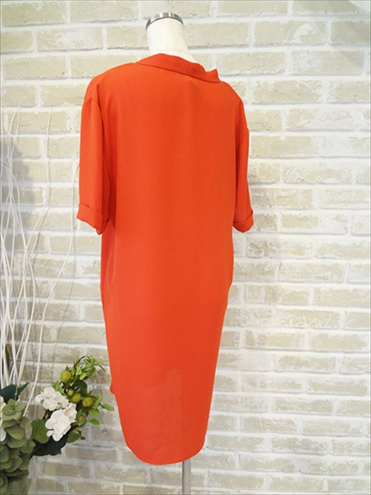赤みがかかったオレンジのドレス。長めの袖にとてもカジュアルなデザインで、一枚でサラッと着ていただけます。女子会や食事会などで使いやすいドレスです。首元のタイをリボンにすると無地にリボンでアクセントになり可愛らしいです。